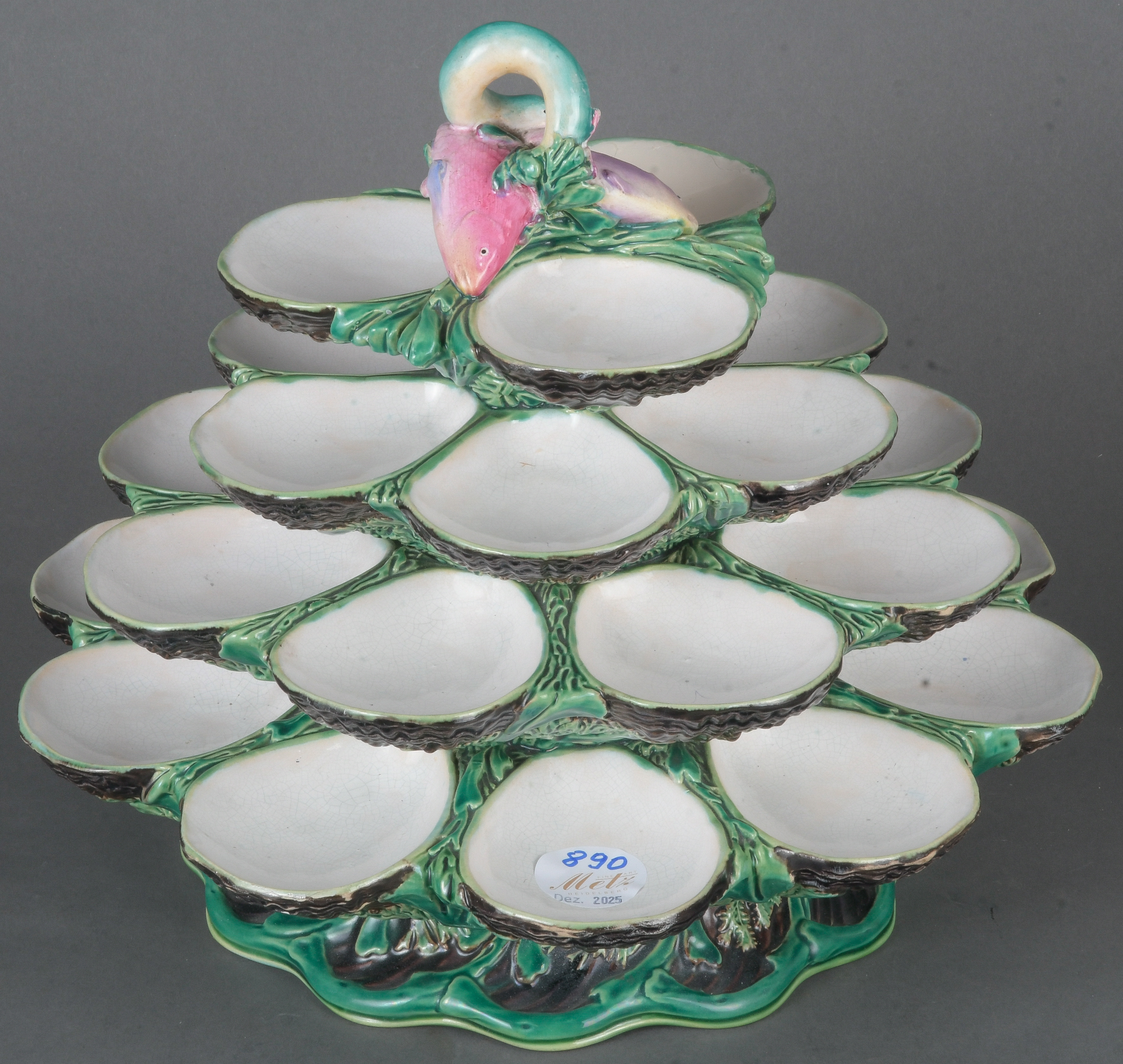 - Katalog-Nr: 890Austernétagère. Wohl Frankreich. Keramik, farbig staffiert; vierstufig für insgesamt 27 Austern, H=26 cm, D=30 cm.o.L.