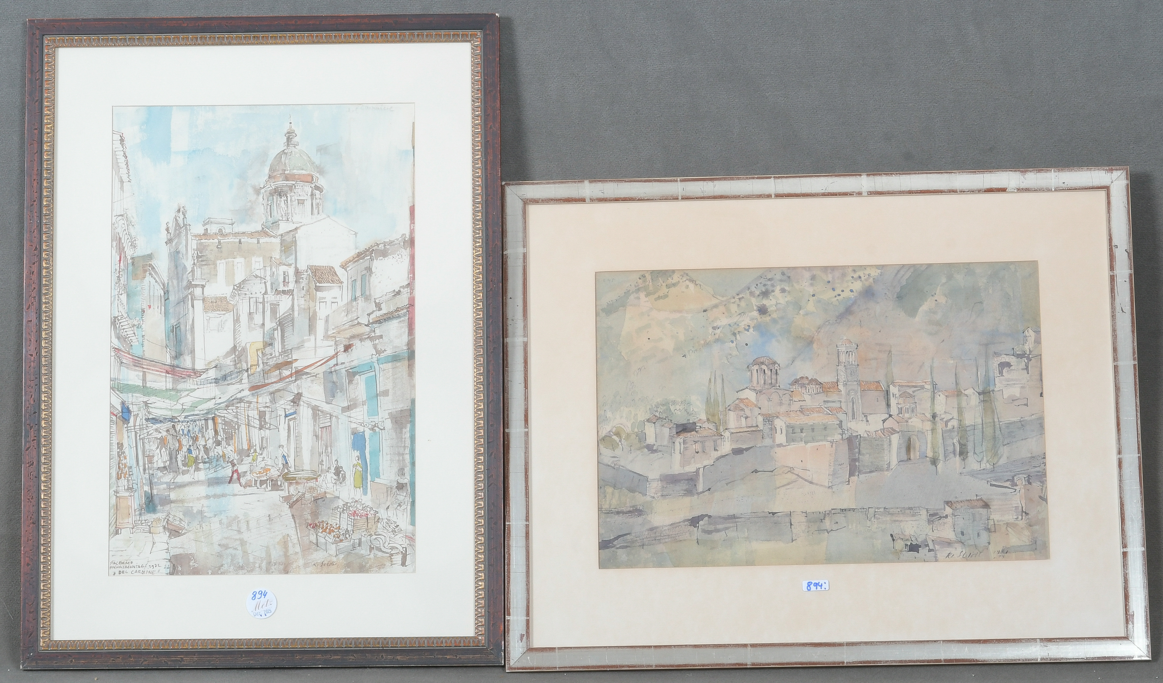 - Katalog-Nr: 894Karl Seidl (Maler des 20. Jhs.). Ansicht von „Palermo Del Carmine“ und südländisches Dorf. Zwei Aquarelle/Papier, li./u./bez./dat. Pfingstmontag 1972 bzw. re./u./sign./dat. 1967, mit Passepartout hi./Gl. gerahmt, 30 x 44 / 47 x 30 cm.o.L.