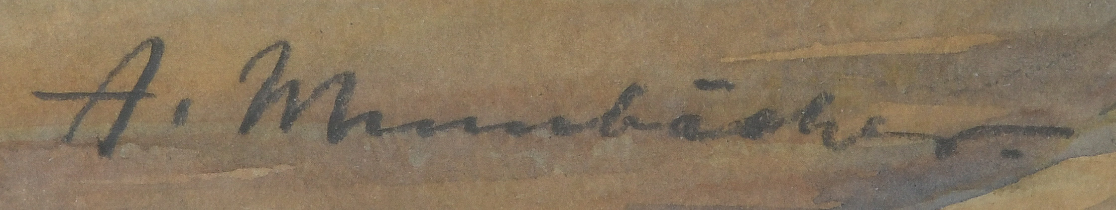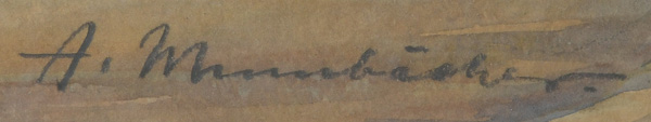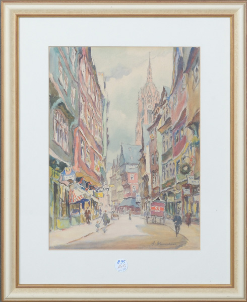 - Katalog-Nr: 895Alfred Mumbächer (1888-1953). Straßenflucht mit dem Frankfurter Kaiserdom. Aquarell/Papier, re./u./sign., mit Passepartout hi./Gl. gerahmt, 47 x 34,5 cm.o.L.