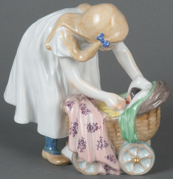 - Katalog-Nr: 877Mädchen mit Puppenwagen. Meissen 20. Jh. Porzellan, bunt bemalt; am Boden unterglasurblaue Schwertermarke, Modell nach Konrad Hentschel, H=13,3 cm.o.L.