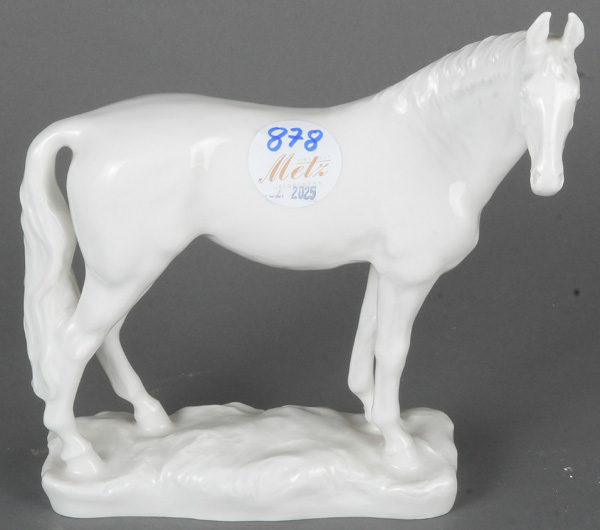 - Katalog-Nr: 878„Halla“ (1945-1979), legendäres Springpferd. Meissen 1978. Porzellan, weiß glasiert, verso am Sockel unterglasurblaue und eingepresste Schwertermarke, Entwurf von Jörg Danielzyk, H=19 cm.o.L.
