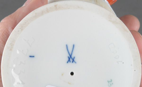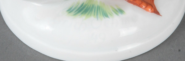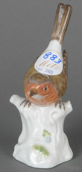 - Katalog-Nr: 883Rotkehlchen. Meissen 20. Jh. Porzellan, naturalistisch modelliert und staffiert; am Boden unterglasurblaue Schwertermarke, Modell nach Johann Joachim Kaendler, H=14,7 cm.o.L.