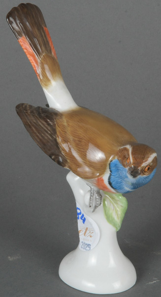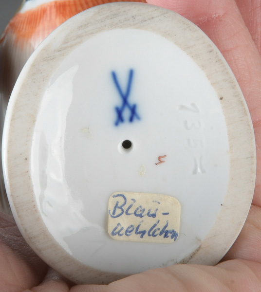- Katalog-Nr: 884Blaukehlchen. Meissen 20. Jh. Porzellan, naturalistisch modelliert und staffiert; am Boden unterglasurblaue Schwertermarke, Modell nach Johann Joachim Kaendler, H=15,5 cm.o.L.