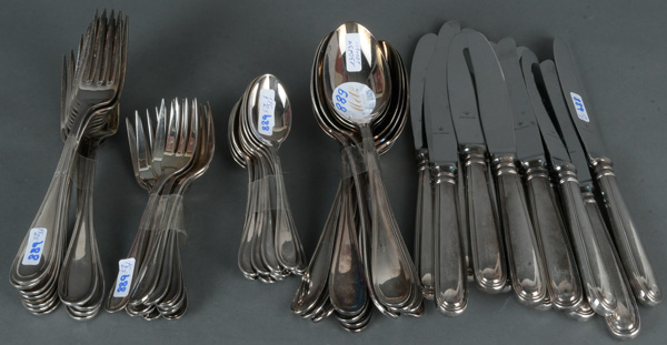 - Katalog-Nr: 88958-tlgs. Speisebesteck. Bremen, Wilkens & Söhne 20. Jh. 925er Sterlingsilber, ca. 2.800 g, verso gepunzt. Bestehend aus: Je zwölf Messer, Gabeln, Suppenlöffel und Kuchengabeln sowie zehn Kaffeelöffel.o.L.