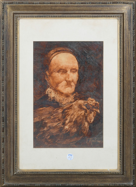 - Katalog-Nr: 899Franz Alekseevic Roubaud (1856-1928). Kaukasische Bäuerin mit Huhn. Öl/Papier, re./u./sign., mit Passepartout hi./Gl. gerahmt, 49,5 x 34 cm.o.L.