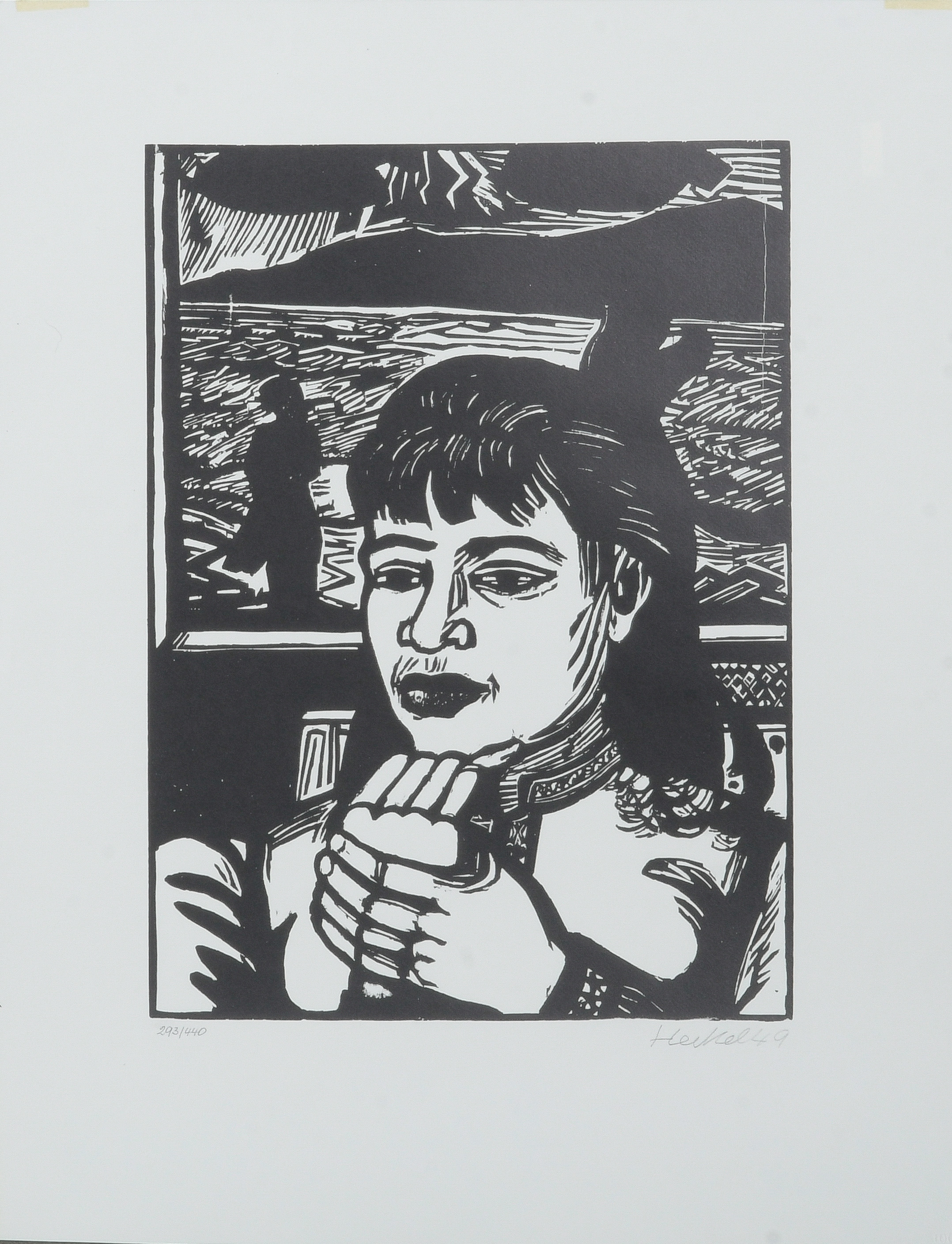 - Katalog-Nr: 926Erich Heckel (1883-1970). „Junge Frau“. Holzschnitt 293/440, re./u./sign./dat. (19)49, 41 x 29 cm.o.L.