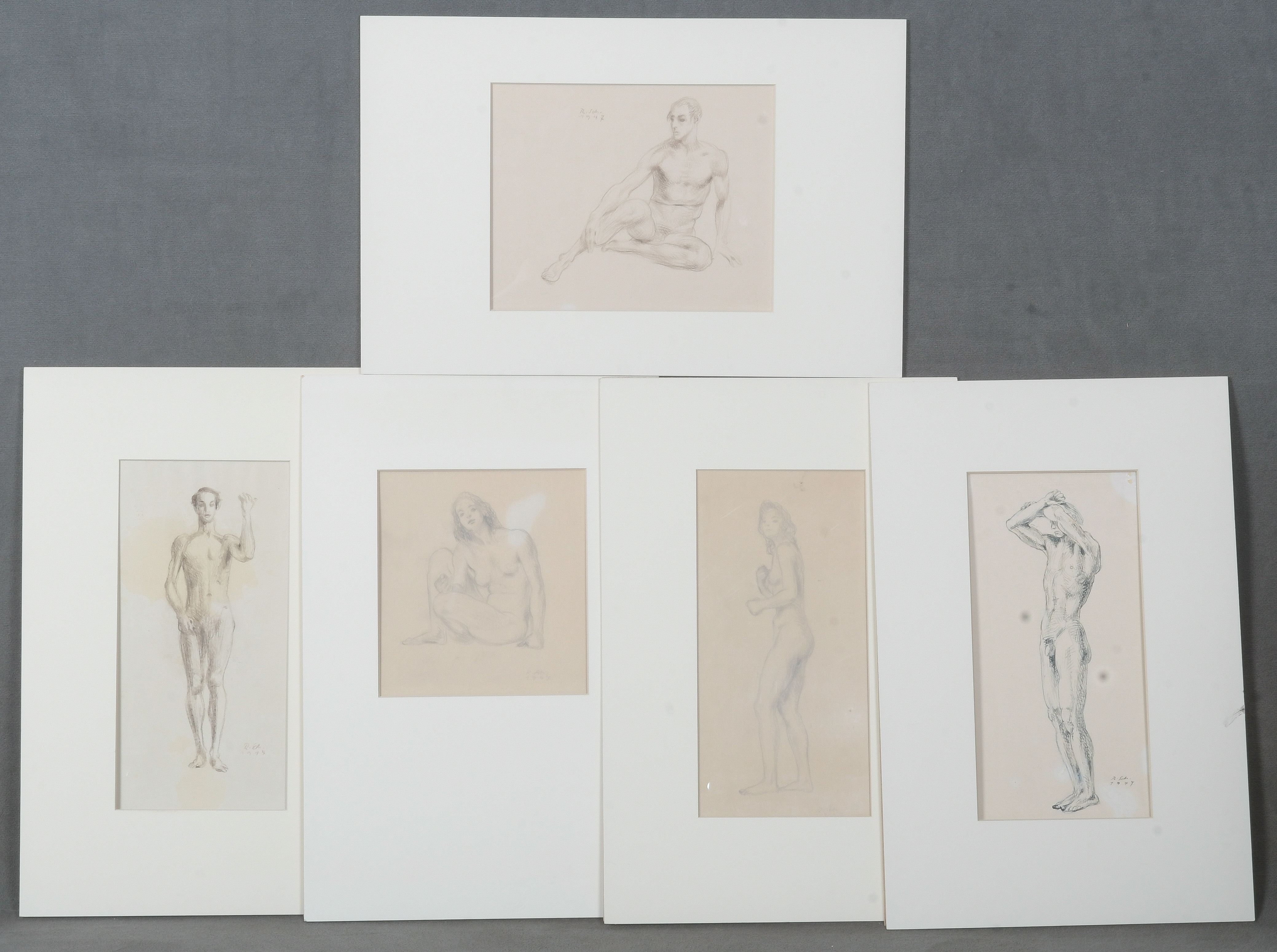 - Katalog-Nr: 930Richard Scheibe (1879-1964). Männer- und Frauenakte. Fünf Zeichnungen, re./u./monogr./dat. 1944 / 1947, mit Passepartout, 17 x 15 bis 35 x 10 cm.o.L.
