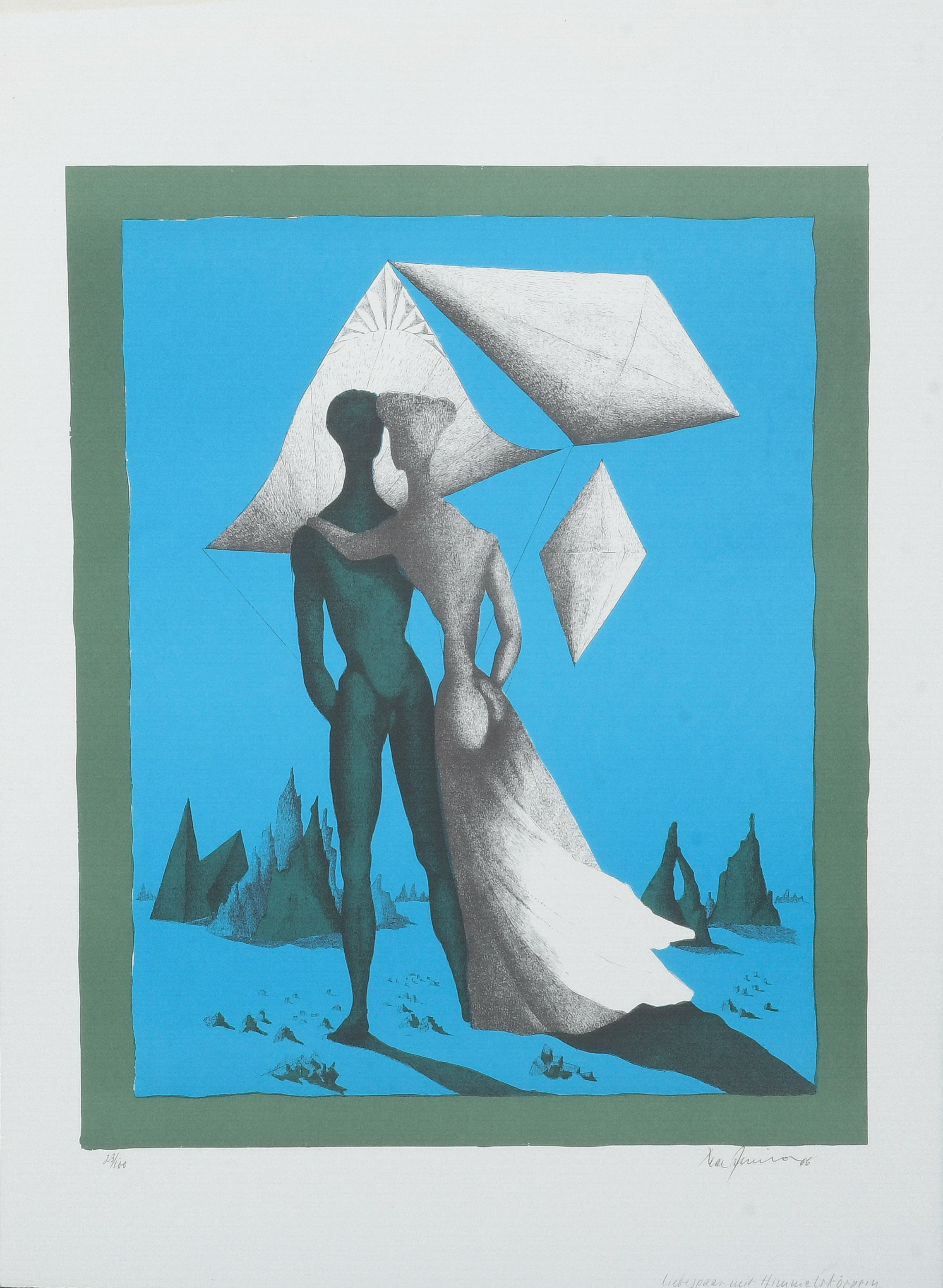 - Katalog-Nr: 931Mac Zimmermann (1912-1995). Surrealistische Komposition mit Figurenpaar. Farblithographie 23/200, re./u./sign./dat. 1966, 51,5 x 41,5 cm.o.L.