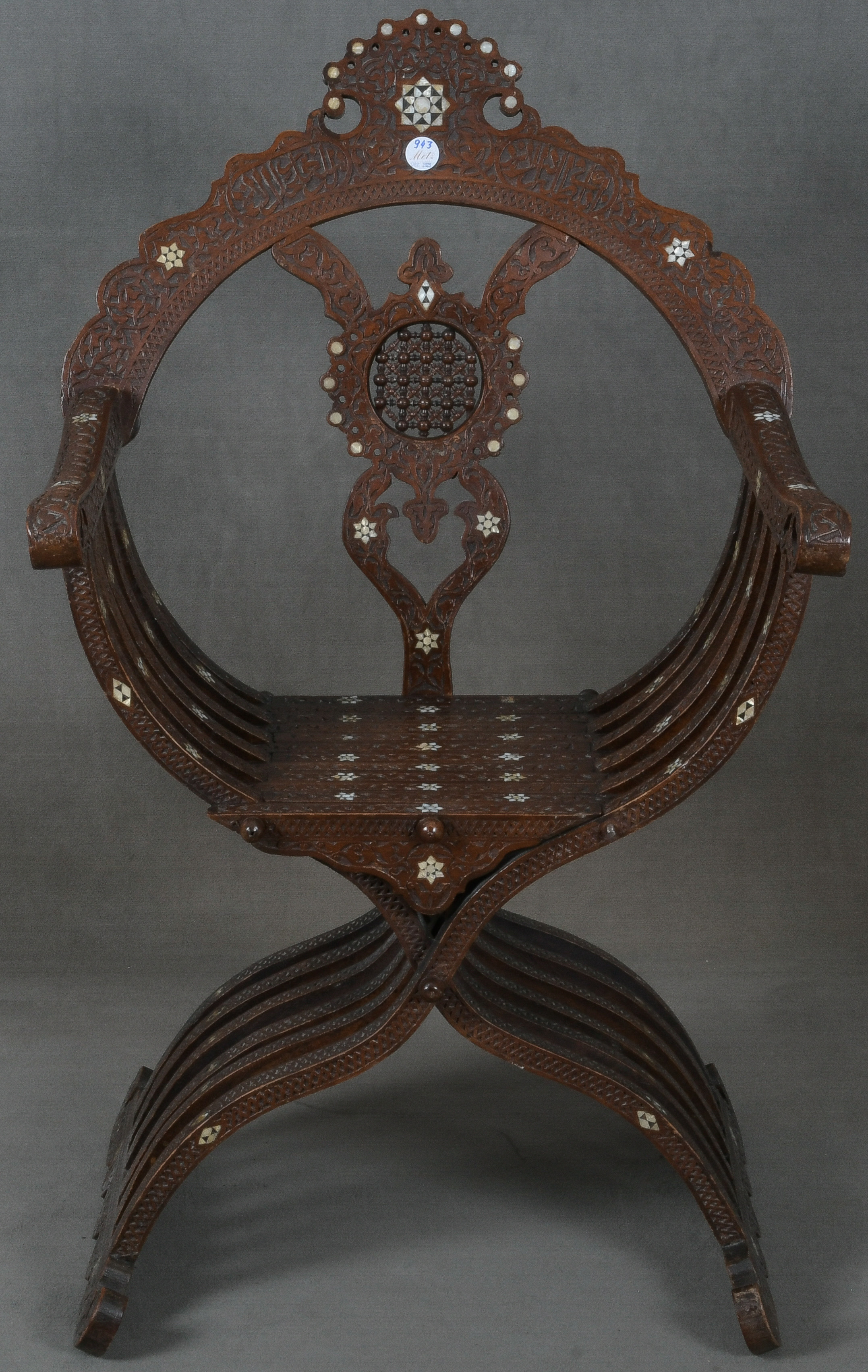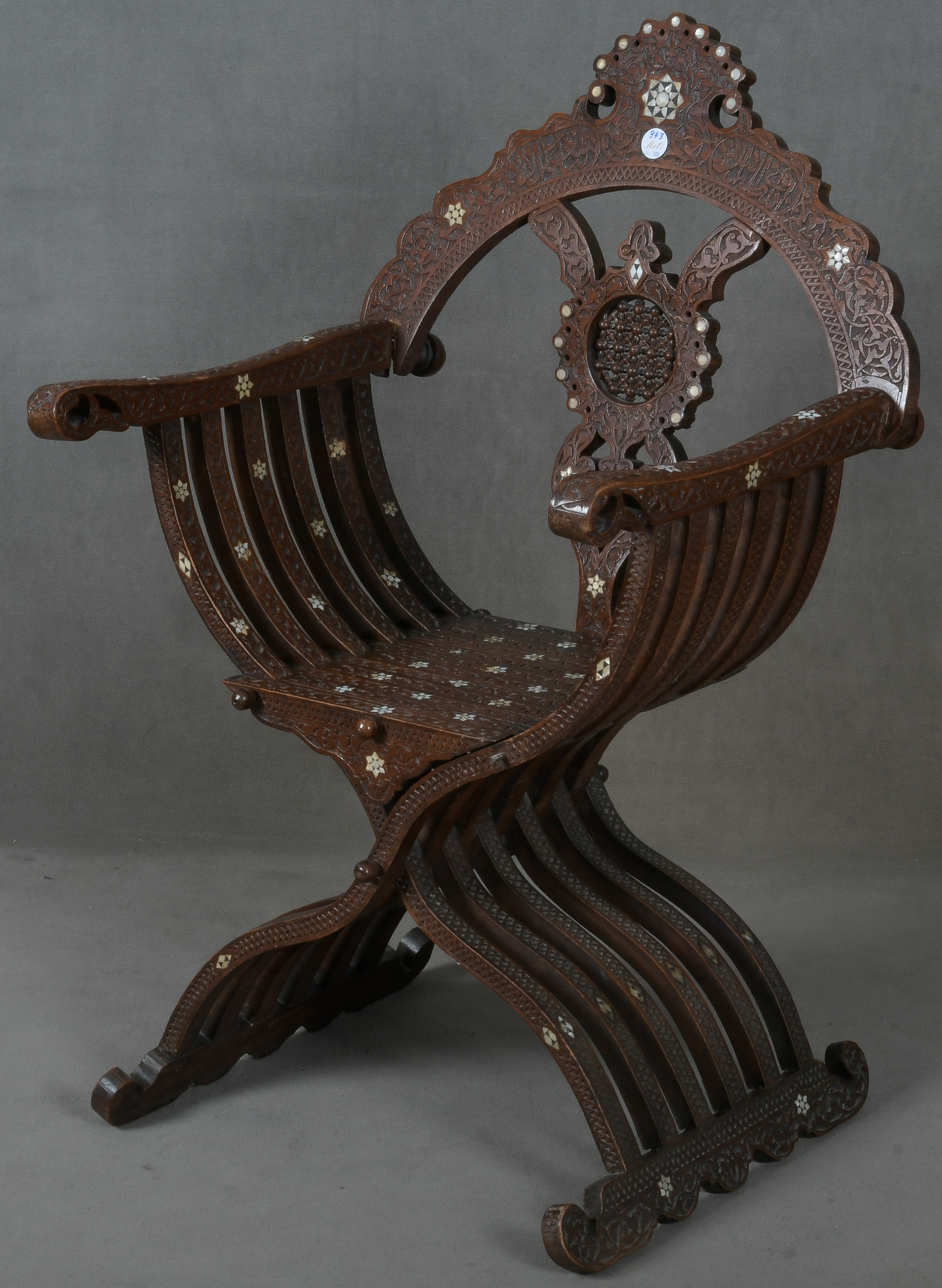 - Katalog-Nr: 943Scherensessel. Marokko. Massivholz, geschnitzt, mit Perlmutteinlagen.o.L.
