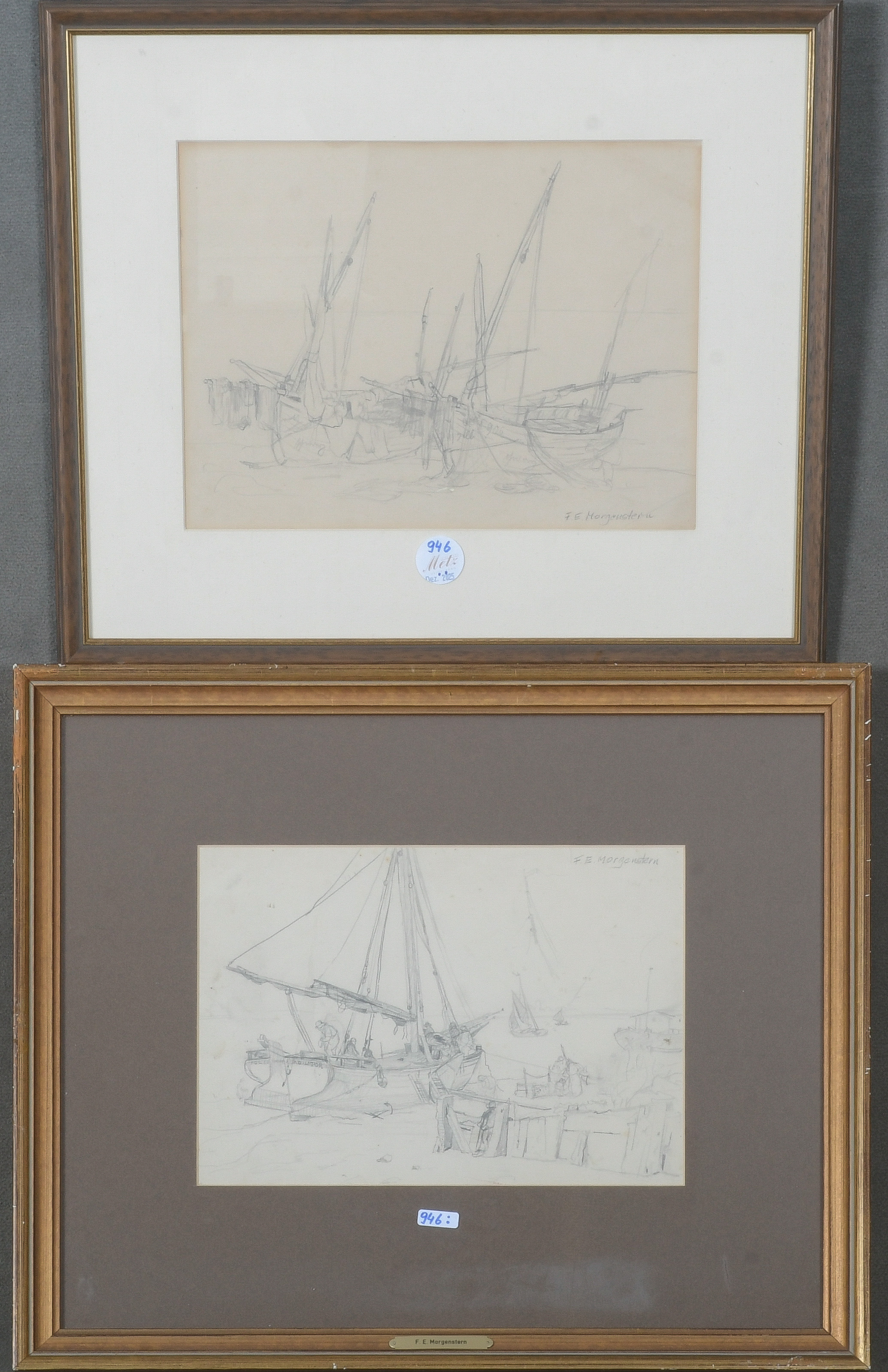 - Katalog-Nr: 946Friedrich Ernst Morgenstern (1853-1919). Segelboote am Strand. Zwei Bleistiftzeichnungen, re./u./sign., mit Passepartout hi./Gl. gerahmt, 23 x 32 / 22 x 30 cm.o.L.
