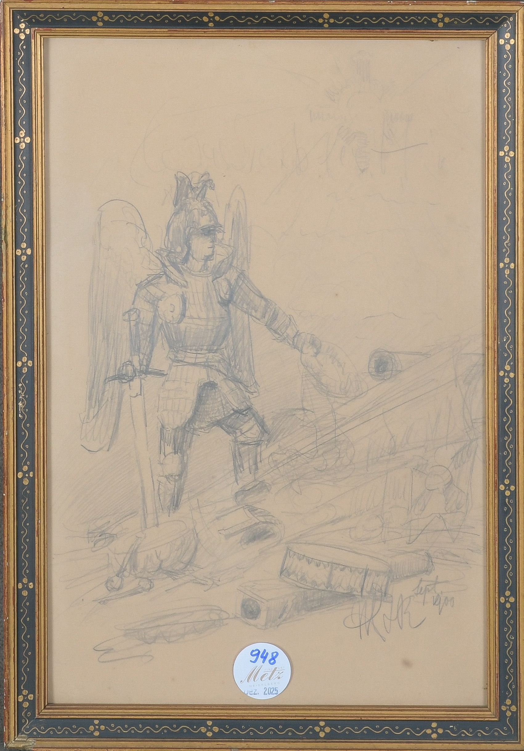 - Katalog-Nr: 948Karl Emil II Doepler (1855-1922). Kaiser Wilhelm II für ein Gedenkblatt „Des Trost Grundes für Hinterbliebene der in China gefallenen Krieger Sept. 1900“. Bleistiftskizze, re./u./sign./dat. 1900, verso bez., 36 x 24 cm.o.L.