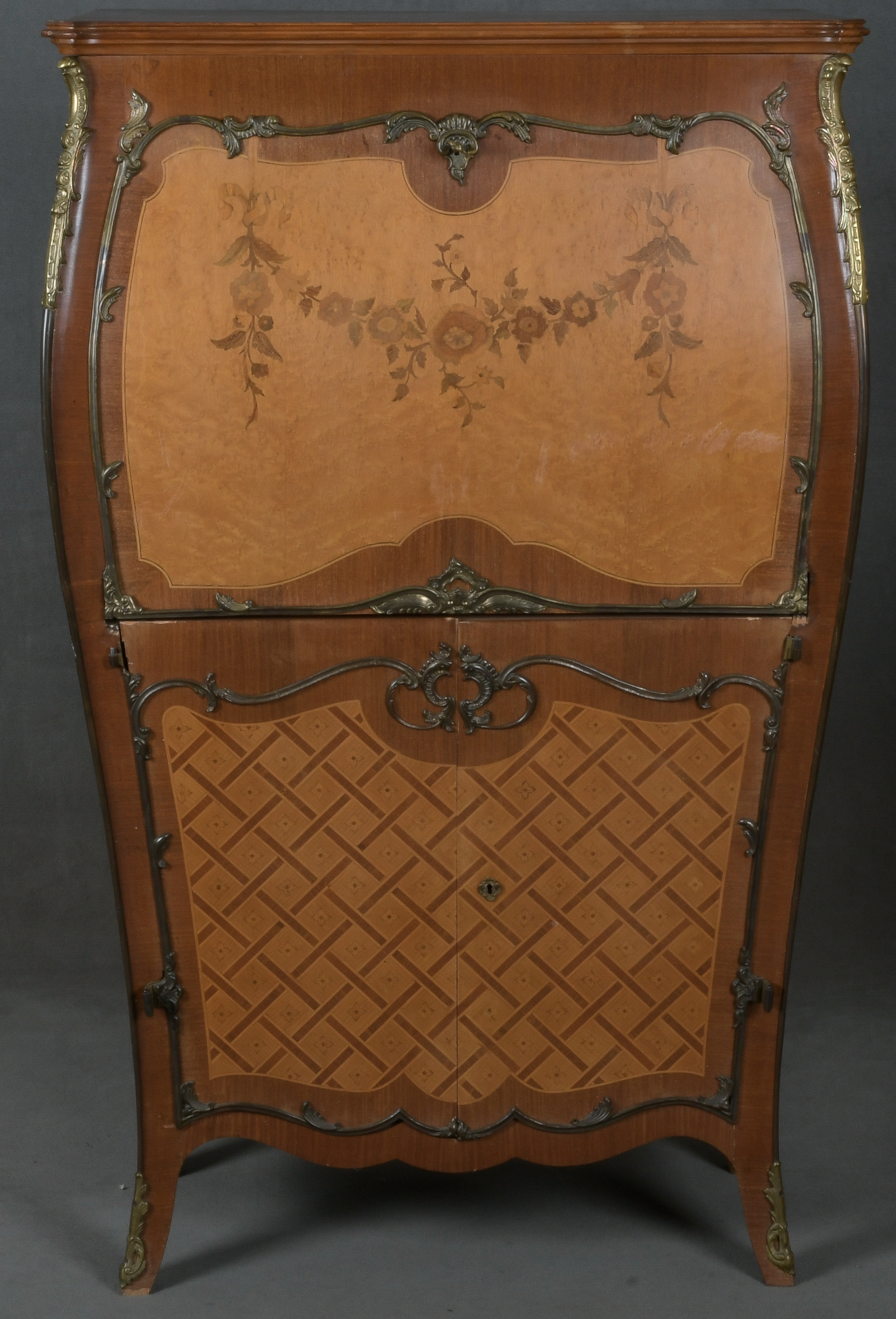 - Katalog-Nr: 949Standsekretär im Transition-Stil. Frankreich 20. Jh. Furniert mit exotischen Hölzern und marketiert mit Blumen, Blättern, Band-, Faden- und Würfelmuster, Bronzebeschläge; nach außen gestellte geschweifte Füße und Zarge, leicht gebogener Korpus, zweitürig, Schreibklappe mit Inneneinteilung, überstehende, profilierte Platte, H=134 cm, B=82 cm, T=44 cm.o.L.