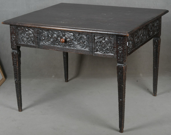 - Katalog-Nr: 934Louis XVI-Tisch. Deutsch 18./19. Jh. Massiv Eiche, geschnitzt mit Blüten, Knospen, Kerben und Trauben; sich nach unten verjüngende Beine, einschübiger Tischkasten, überstehende, profilierte Platte, H=82 cm, B=110 cm, T=96 cm. (Platte ergänzt)o.L.