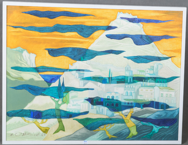 - Katalog-Nr: 937Hermann Schmidt-Schmied (1924-2010). Stadtansicht im Gebirge bei bewölktem Himmel. Öl/Lw., li./u./sign./dat. (19)65, gerahmt, 75 x 97 cm.o.L.