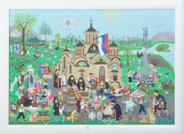 - Katalog-Nr: 940Zuzana Chalupová (1925-2001). Festliche Gesellschaft vor orthodoxer Kirche. Öl/Lw., re./u./sign./dat. 1977, gerahmt, 70 x 99 cm.o.L.