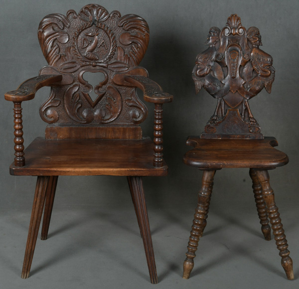 - Katalog-Nr: 941Fratzenstuhl und -armlehnsessel. Deutsch um 1900. Massiv Nussbaum, teilw. gedrechselt und geschnitzt mit Blumen, Blättern und Tiermotiven.o.L.