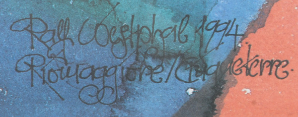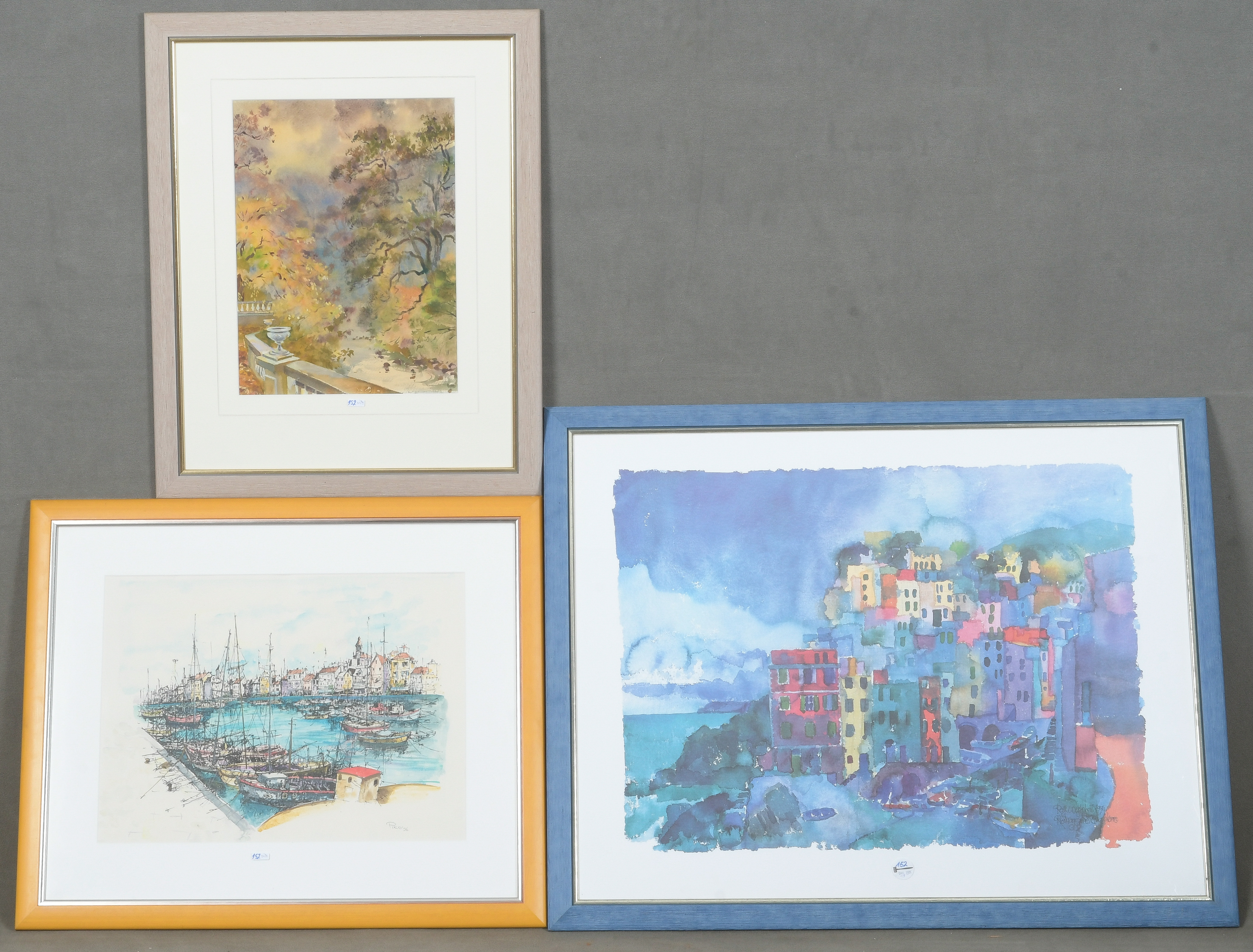 - Katalog-Nr: 152Ralf Westphal (1934-2014). „Riomaggiore Cinqueterre“. Aquarell/Papier, re./u./sign./dat 1994; dazu Maler des 20. Jhs. Hafenszene und Parklandschaft, eines dat. (19)96, mit Passepartout hi./Gl. gerahmt, 40 x 53 bis 57 x 77 cm.o.L.