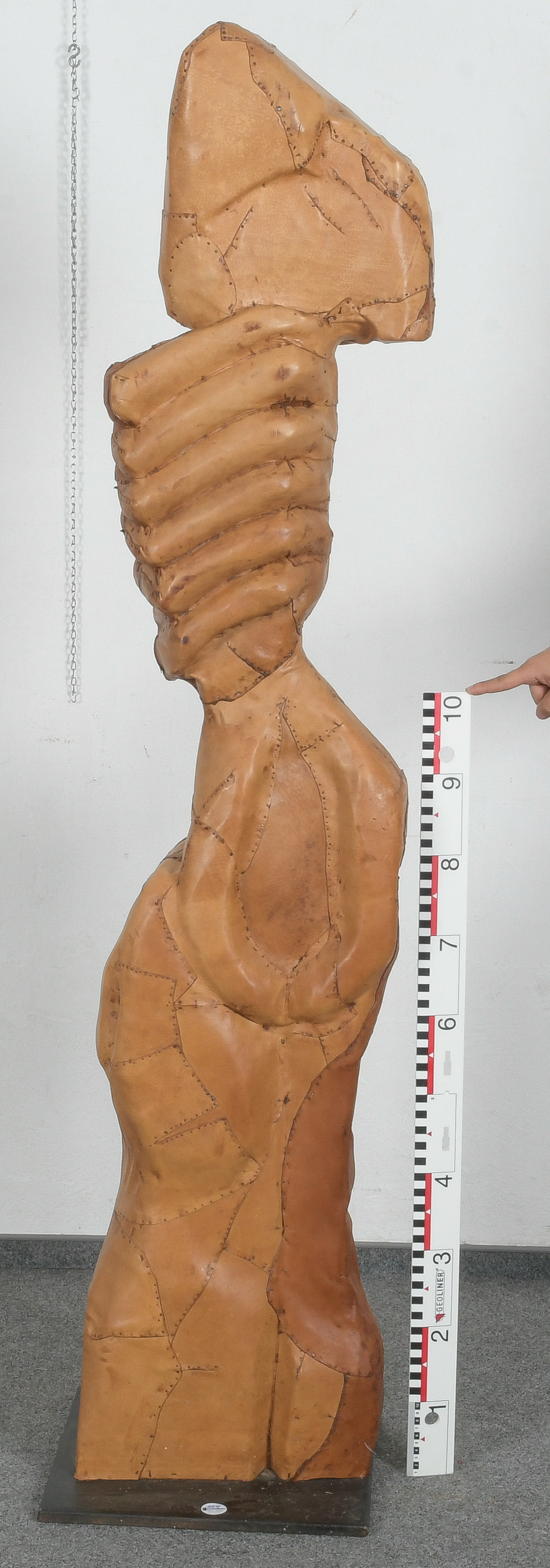 - Katalog-Nr: 154Deutscher Bildhauer des 20. Jhs. Große abstrakte Plastik. Massivholz, geschnitzt, teilw. mit Lederbespannung, seitl. monogr./dat. „S.N. (19)95“, H=178 cm.o.L.