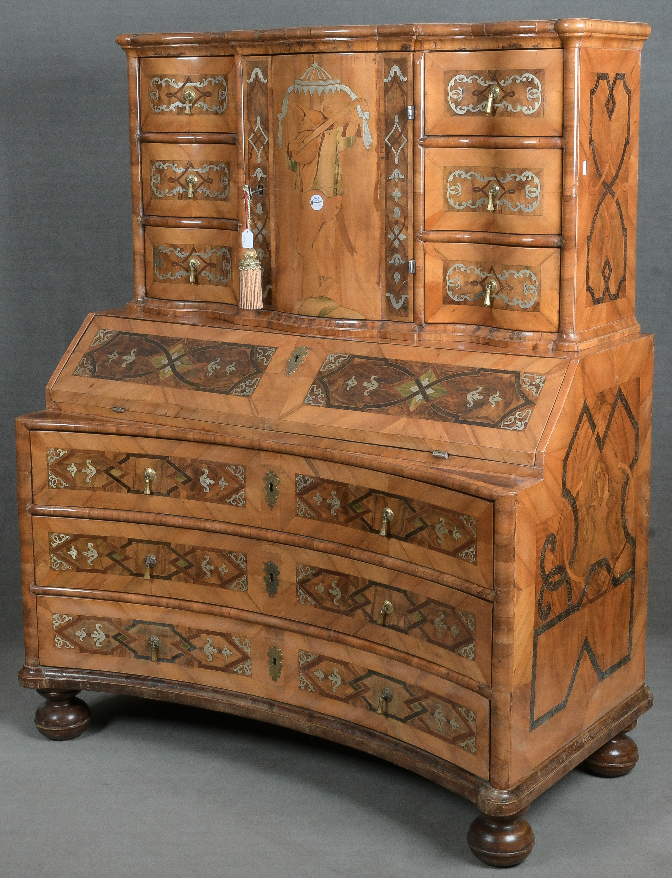 - Katalog-Nr: 155Tabernakelsekretär. Erfurt 1730-40. Nussbaum und Pflaumenholz furniert, marketiert mit Bandelwerk, Blüten, Rocaillen, musizierenden Figuren in Baldachin, teilw. gefärbt und schattiert, mit Zinneinlagen, fein ziselierte Messingbeschläge; Kugelfüße, profilierter Sockel, gebogenes, dreischübiges Unterteil mit Schreibklappe, Aufsatz mit Tabernakeltür, flankiert von je drei Schüben mit Zentralverriegelung, H=155 cm, B=121 cm, T=62 cm.o.L.