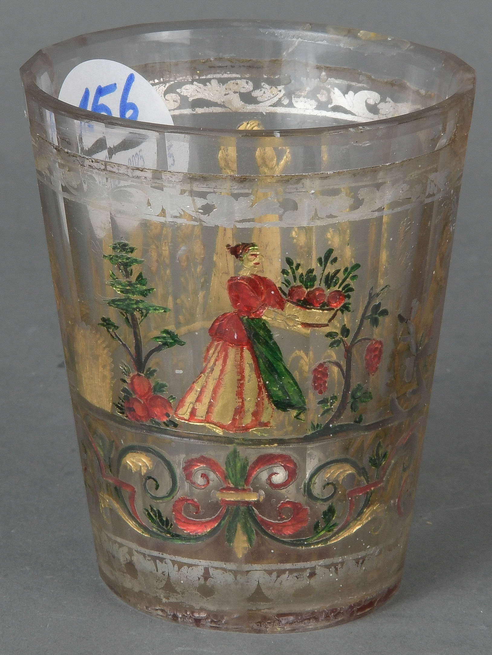 - Katalog-Nr: 156Zwischengoldbecher „Vier Jahreszeiten“. Böhmen um 1750. Farbloses Glas, farbig und gold bemalt mit Figur in Landschaft und Ornamenten, H=8,5 cm. (best.)o.L.