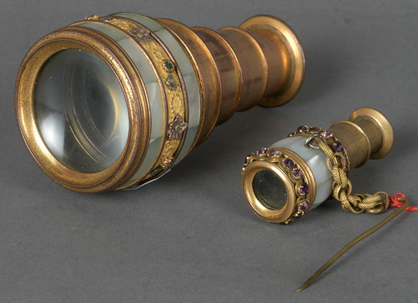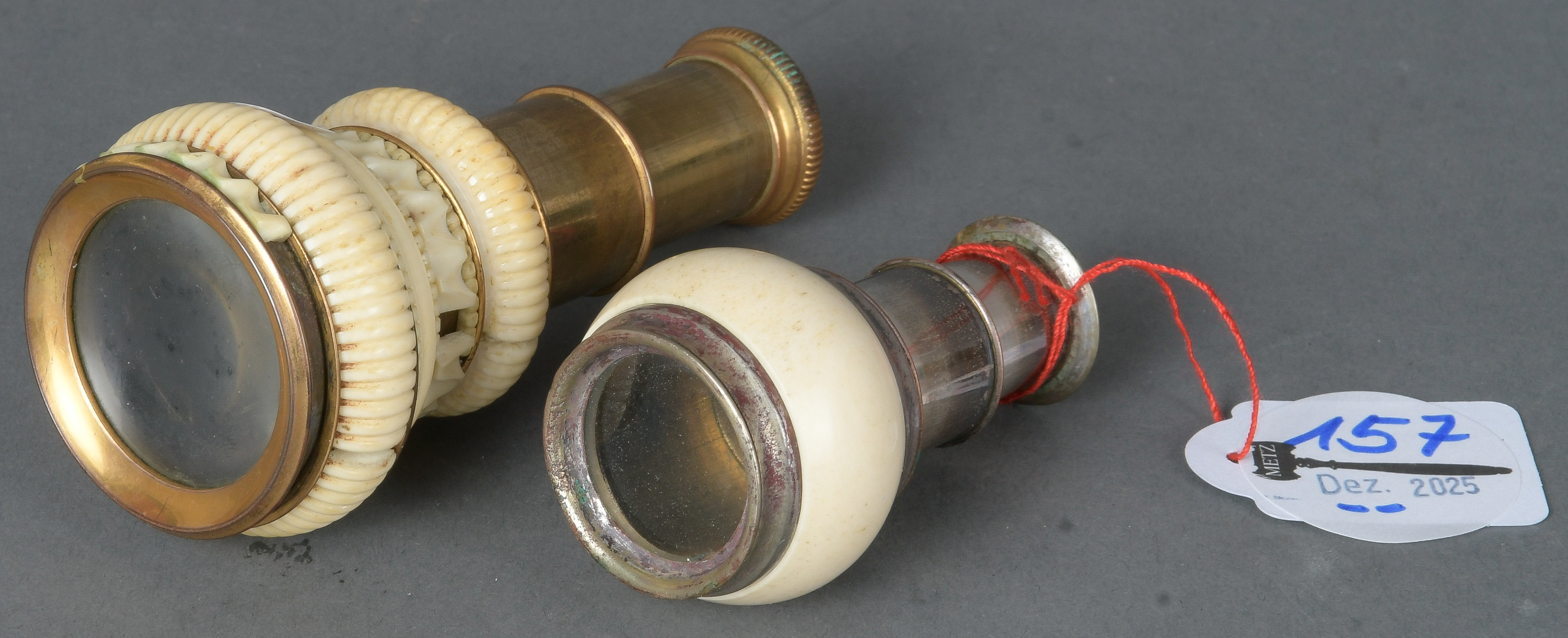 - Katalog-Nr: 157Zwei Operngläser. Frankreich um 1900. Metall, vergoldet, mit Hornummantelung; je auseinanderziehbar, 3,2 / 6,6 bzw. 5,6 / 9,8 cm. (best. / besch.)o.L.