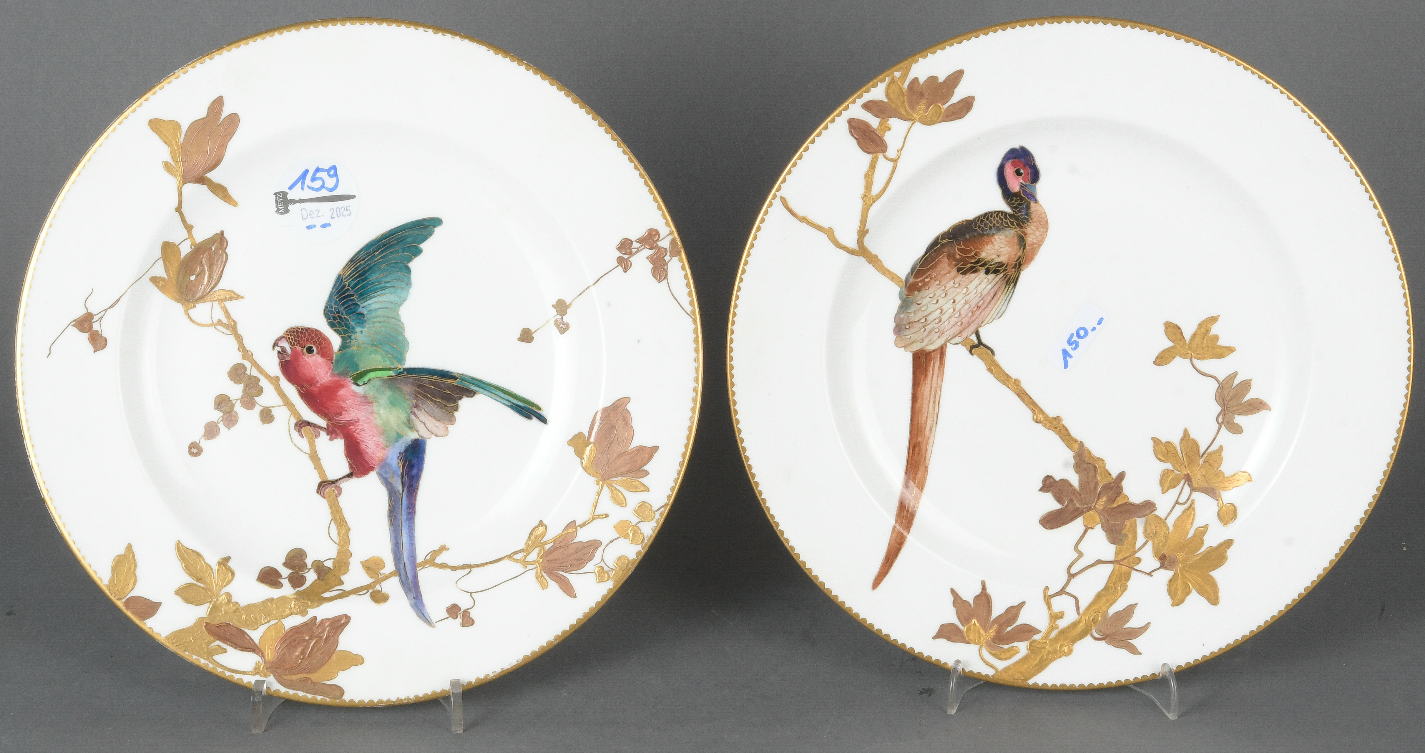- Katalog-Nr: 159Paar Prunkteller. New York, Tiffany & Co 20. Jh. Porzellan, exzellent erhaben dekoriert mit Blütenzweigen und Paradiesvögeln; verso Stempelmarke, je D=23,5 cm.o.L.