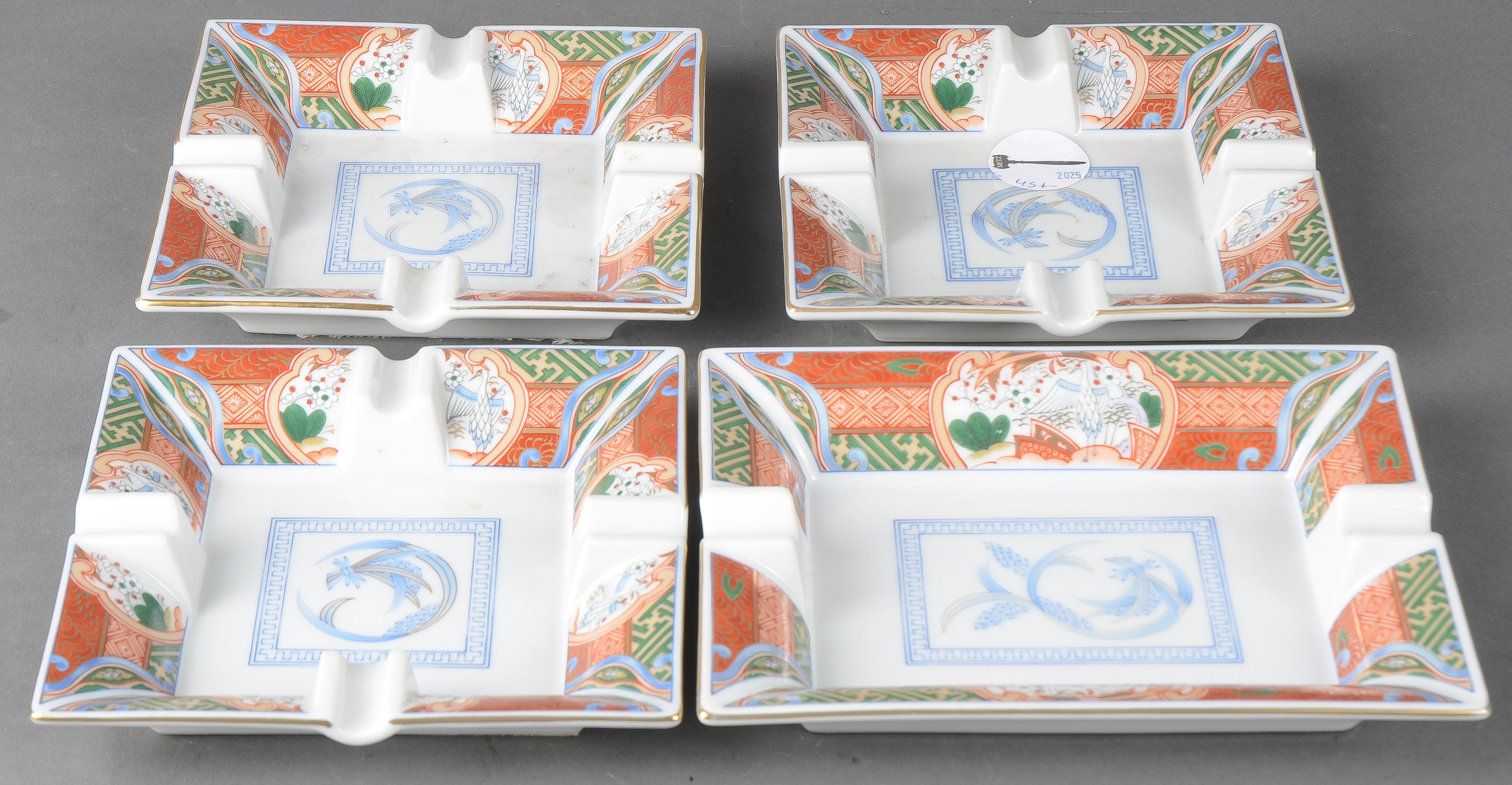 - Katalog-Nr: 165Vier Aschenbecher. Asien. Porzellan, bunt bemalt; am Boden gemarkt, H=3 cm, B=16 cm, T=16 cm / H=3 cm, B=18 cm, T=15,5 cm.o.L.
