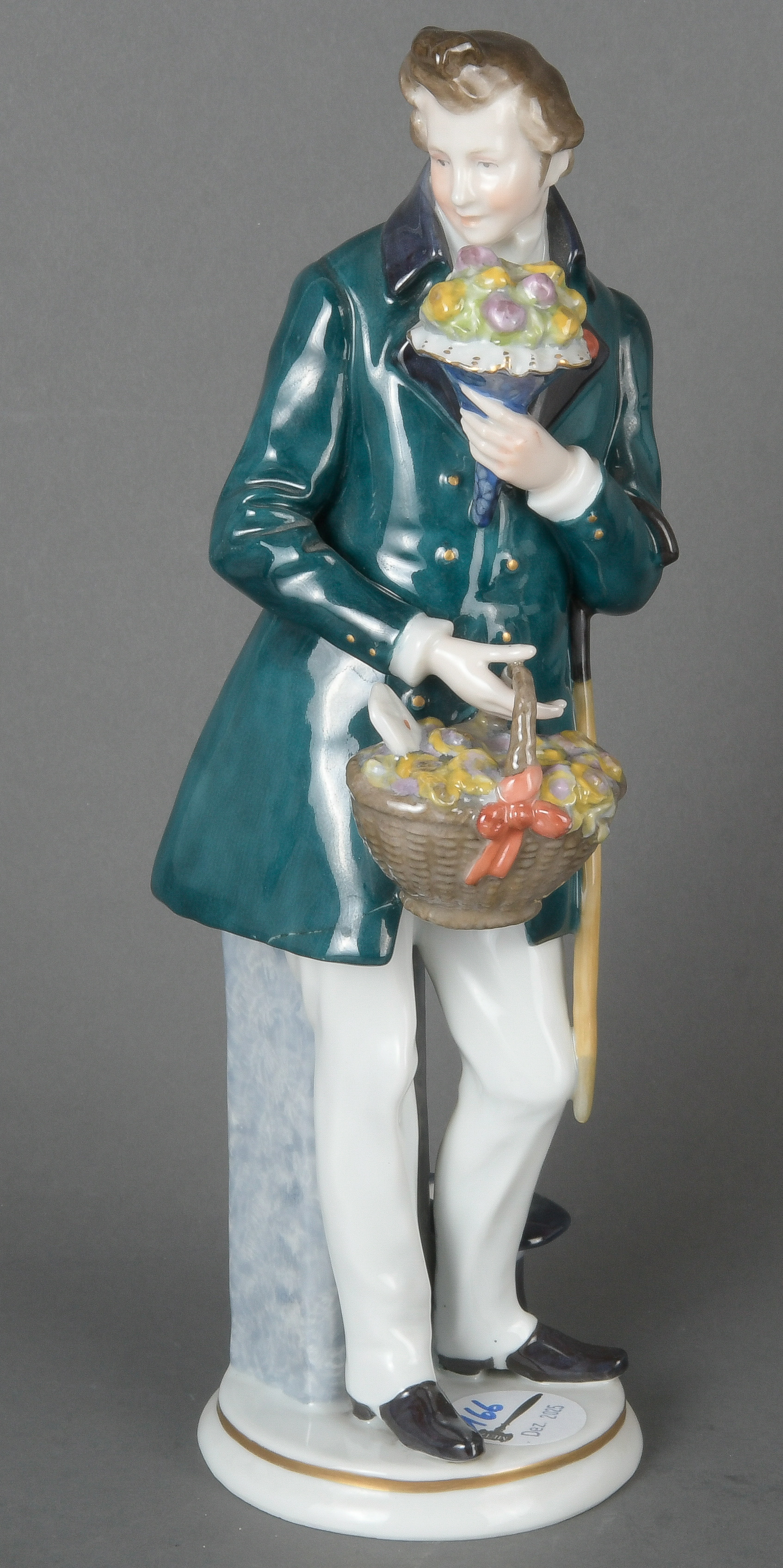 - Katalog-Nr: 166Blumenkavalier. Volkstedt um 1900. Porzellan, bunt bemalt; am Boden gemarkt, H=31,5 cm.o.L.