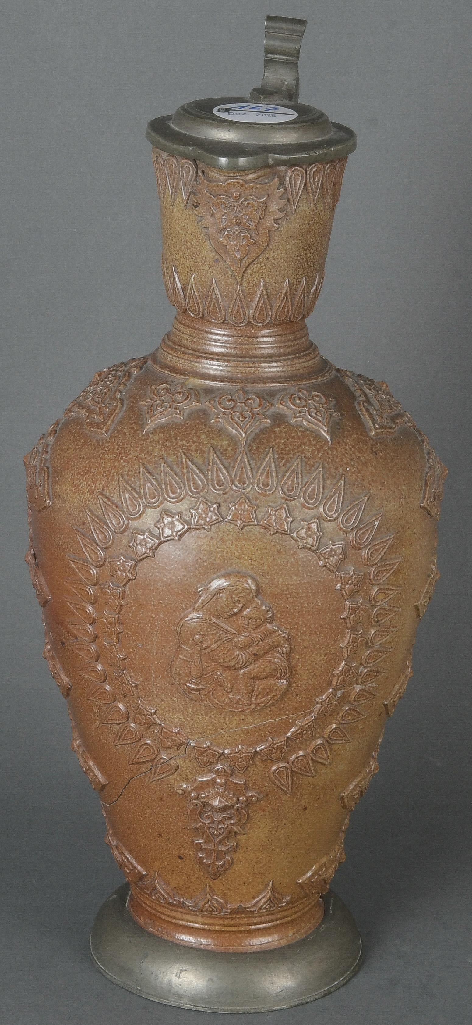 - Katalog-Nr: 167Henkelkanne. Rheinland 19. Jh. Braunes, salzglasiertes Steinzeug mit Ritzreliefdekor, Zinnstandring, -montur und -deckel, H=38 cm. (besch.)o.L.