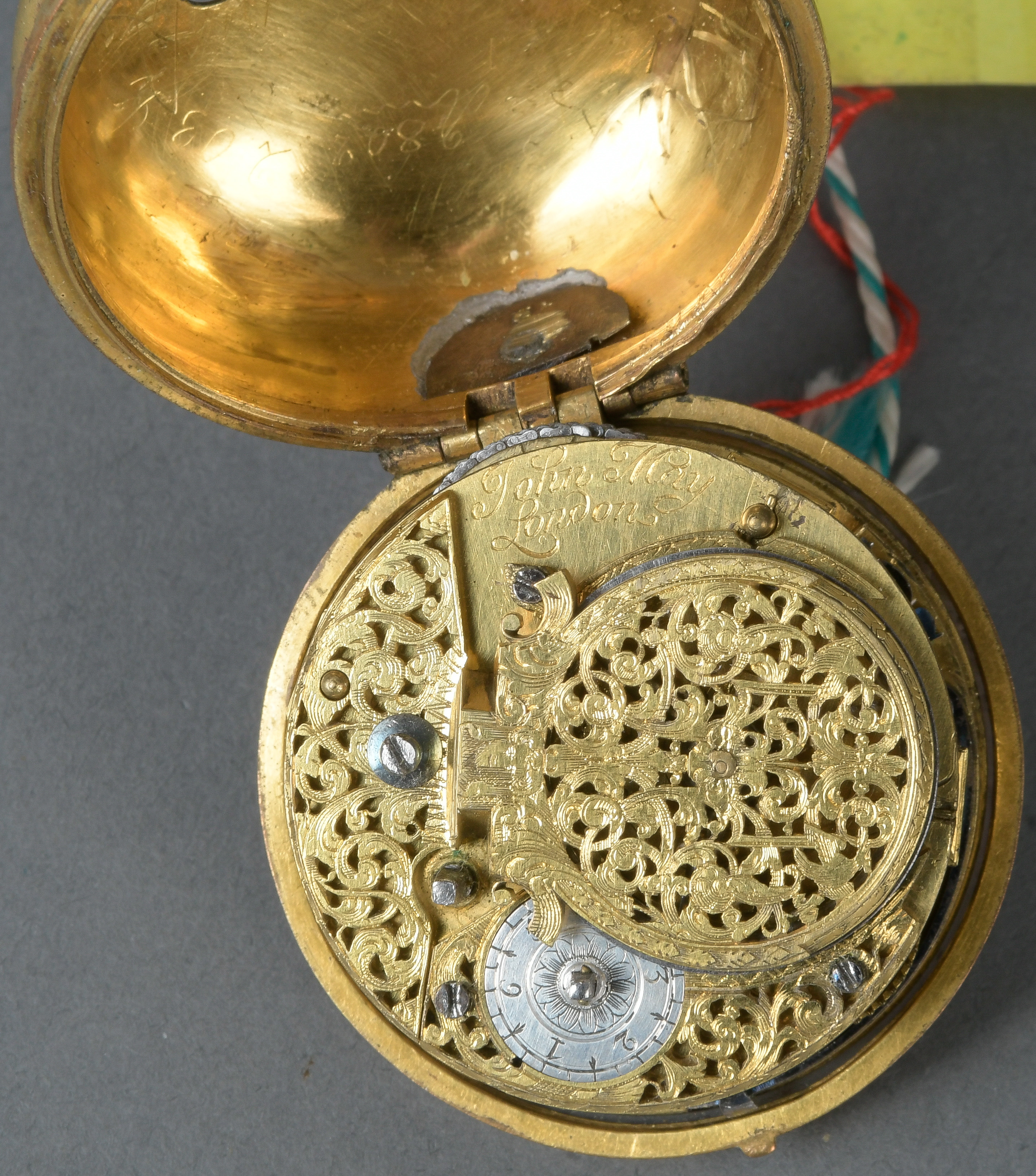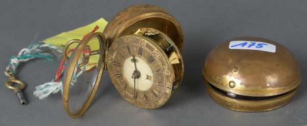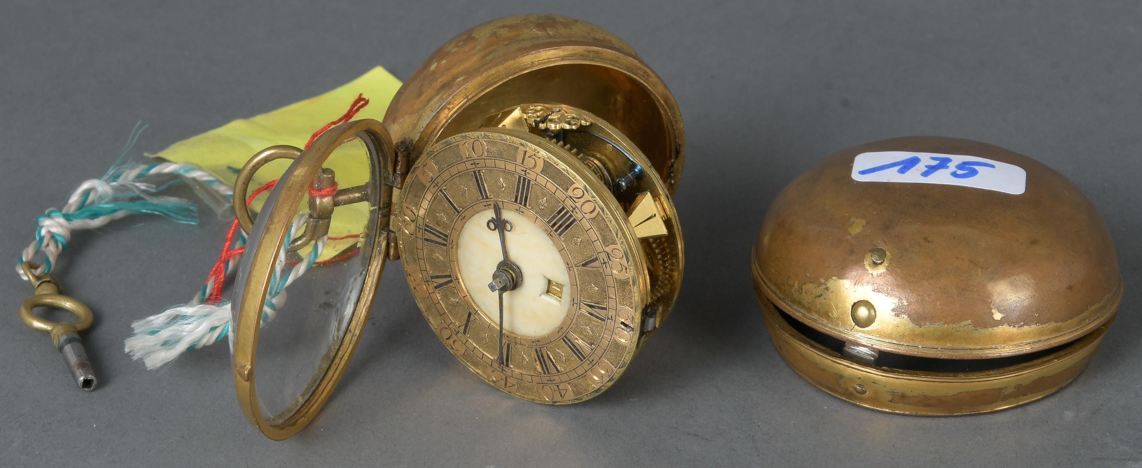 - Katalog-Nr: 175Taschenuhr. London, John May (aktiv 1692-1715). Vergoldet, mit Spindelwerk, verso sign. (D=4,7 cm). Dazu passendes Kupfer-Schutzgehäuse (D=5,4 cm) und Schlüssel. (Funktion ungeprüft)o.L.