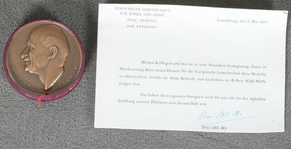 - Katalog-Nr: 162Robert Cochet (1903-1988). Gedenkmedaille „Robert Schuman“. Avers: Porträt Schumans mit Signatur / Revers: „Europäische Gemeinschaft für Kohle und Stahl“ mit Karte und Datierung 9. Mai 1950. Bronze, in Etui (D=6,5 cm) mit Begleitschreiben der Verleihungsfeierlichkeit vom 9. Mai 1964 an Rinaldo Del Bo (1916-1991 / italienischer Politiker und Präsident der EGKS von 1963-1967).o.L.