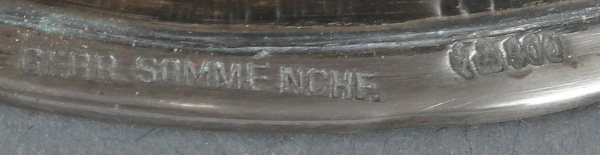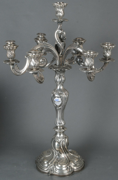 - Katalog-Nr: 168Große Prunkgirandole „Dresdner Hofmuster“. Deutsch, Gebr. Sommé Nachfolger um 1900. 800er Silber, am Rand gepunzt, H=61 cm, D=38 cm.o.L.