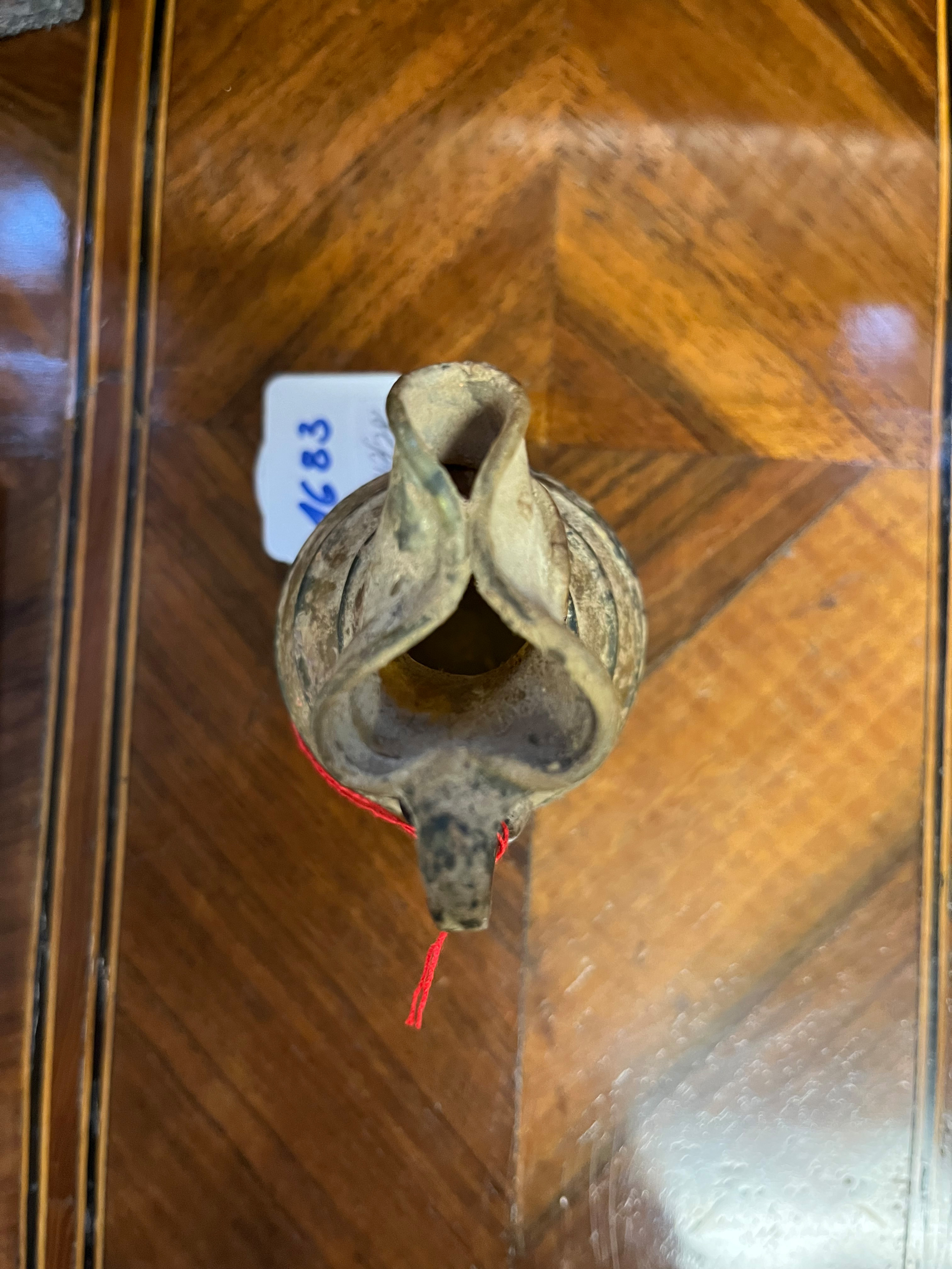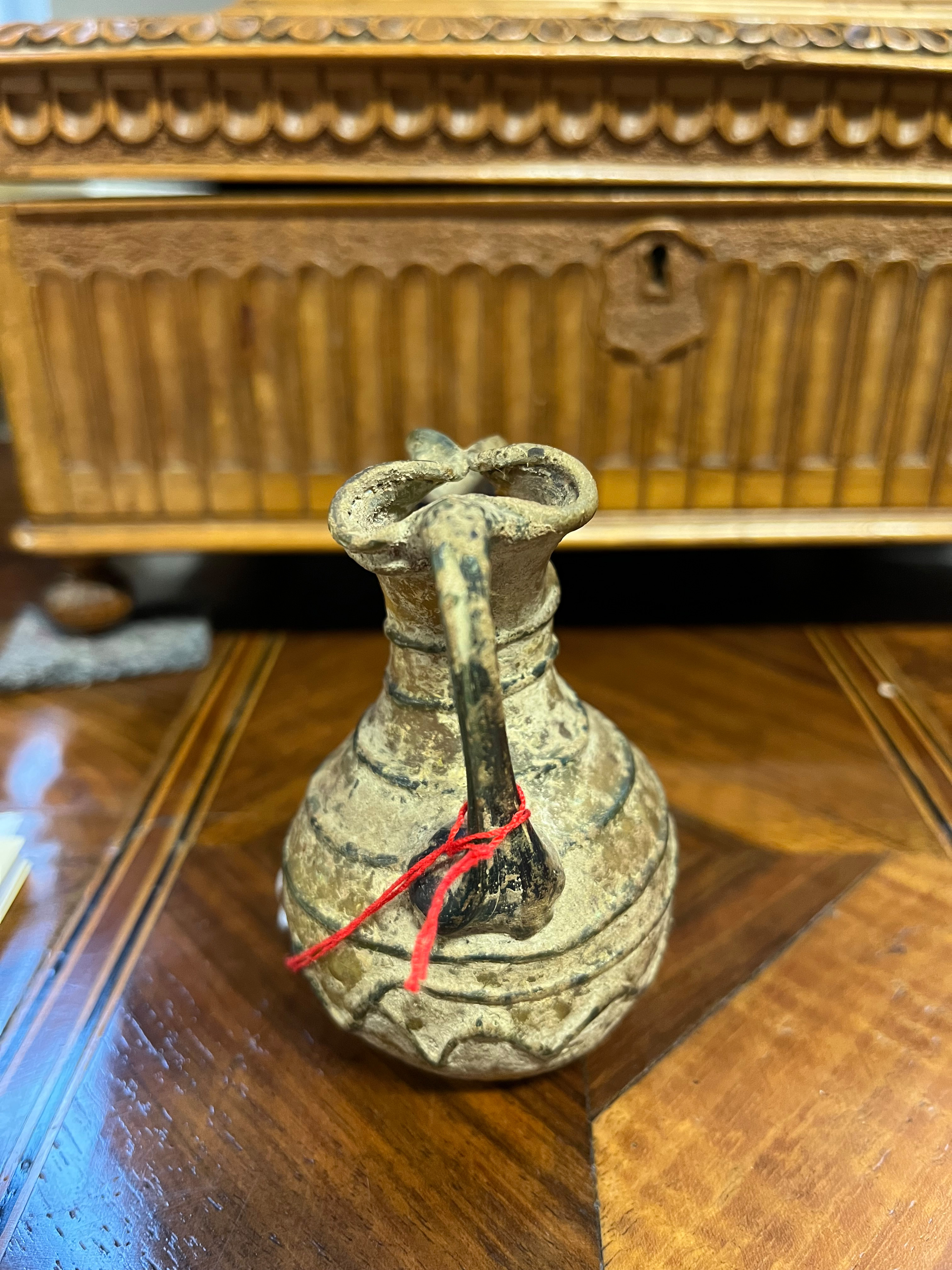 - Katalog-Nr: 1683Henkelkrüglein. Römisch. Glas mit Erdkruste, H=8,4 cm.o.L.