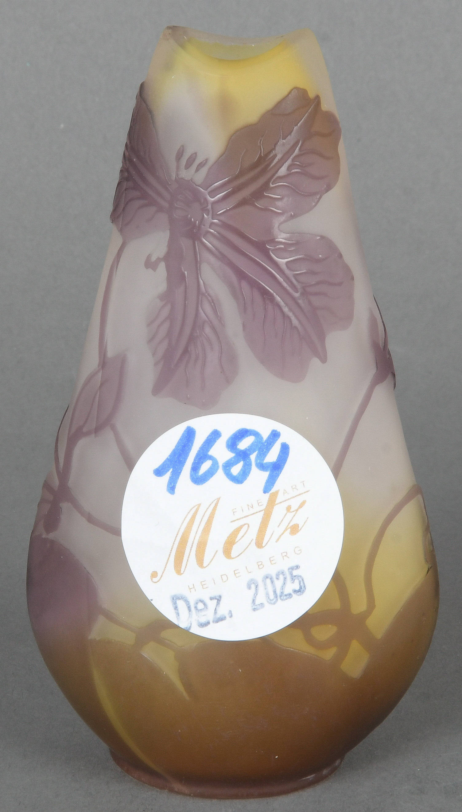- Katalog-Nr: 1684Jugendstil-Vase. Nancy, Émile Gallé um 1900. Farbloses Glas, farbig überfangen, umlaufend floral geschnitten und poliert; an der Wandung sign., H=10,2 cm.o.L.