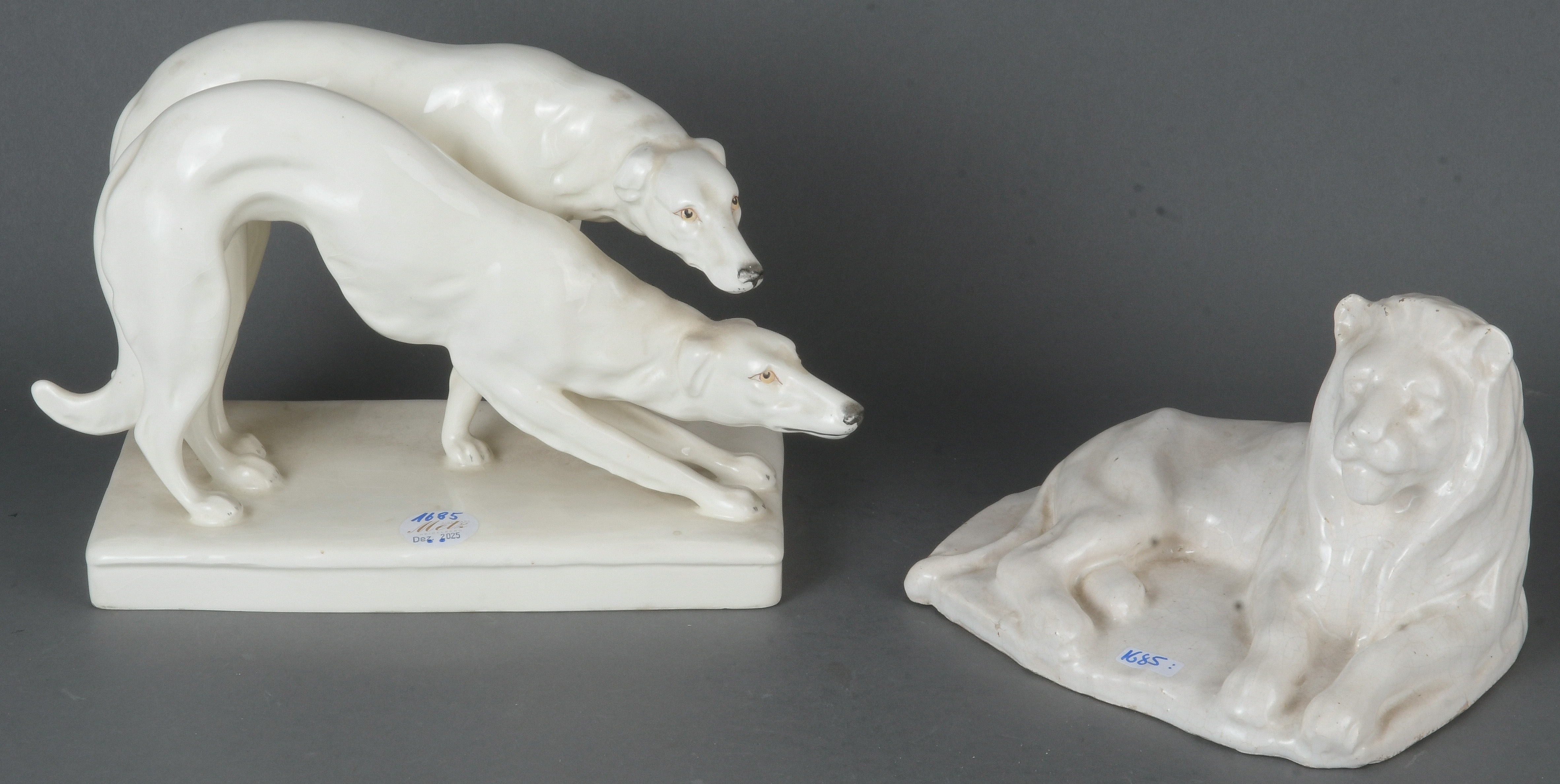 - Katalog-Nr: 1685Windhundpaar und Löwe, u.a. Baden-Oos 20. Jh. Feinsteinzeug / Irdengut, crèmefarben glasiert; teilw. am Boden gemarkt, Entwurf wohl Carl Roth, H=13 / 19,5 cm.o.L.