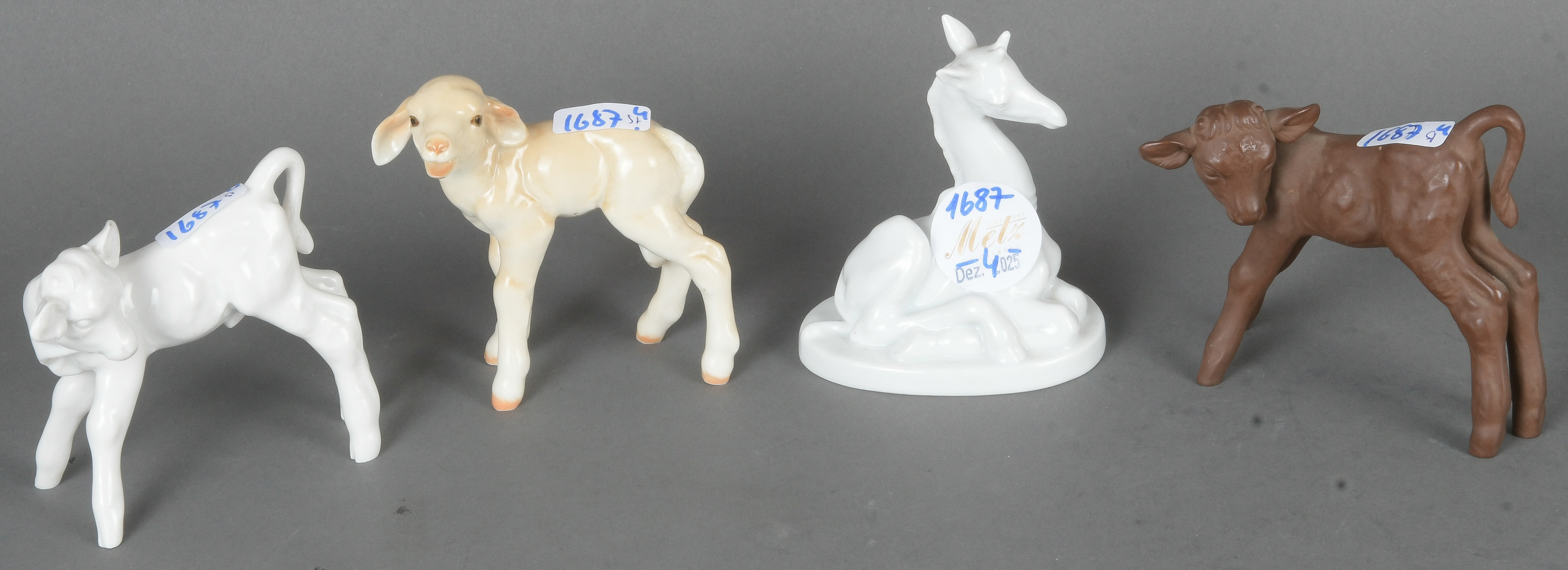 - Katalog-Nr: 1687Giraffe, Lamm und zwei Kälbchen, u.a. Meissen / Rosenthal 20. Jh. Porzellan, bunt bemalt / Böttgersteinzeug, am Boden gemarkt, u.a. Entwurf von Willi Münch-Khé, H=8 bis 9,5 cm.o.L.