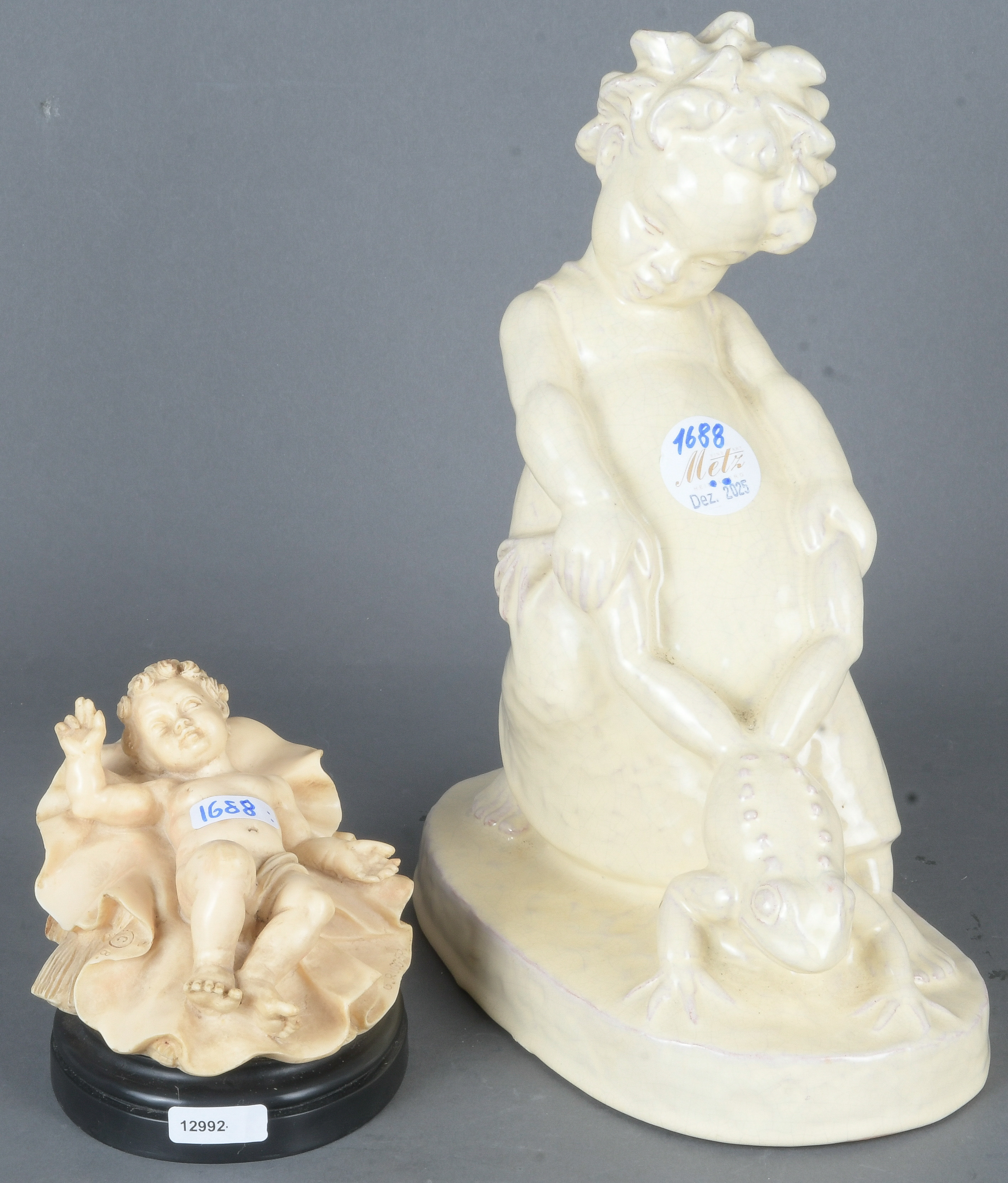 - Katalog-Nr: 1688Putto mit Frosch. Mosbach 20. Jh. Irdengut, bunt bemalt; am Boden gemarkt, H=26 cm; dazu Krippenfigur des Christusknaben, Kunstmasse, H=10 cm.o.L.