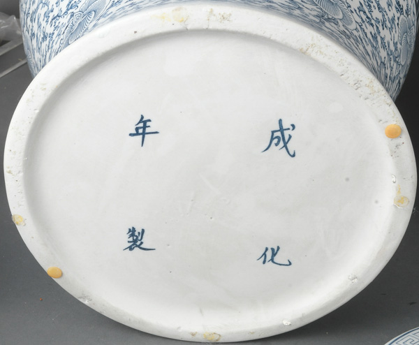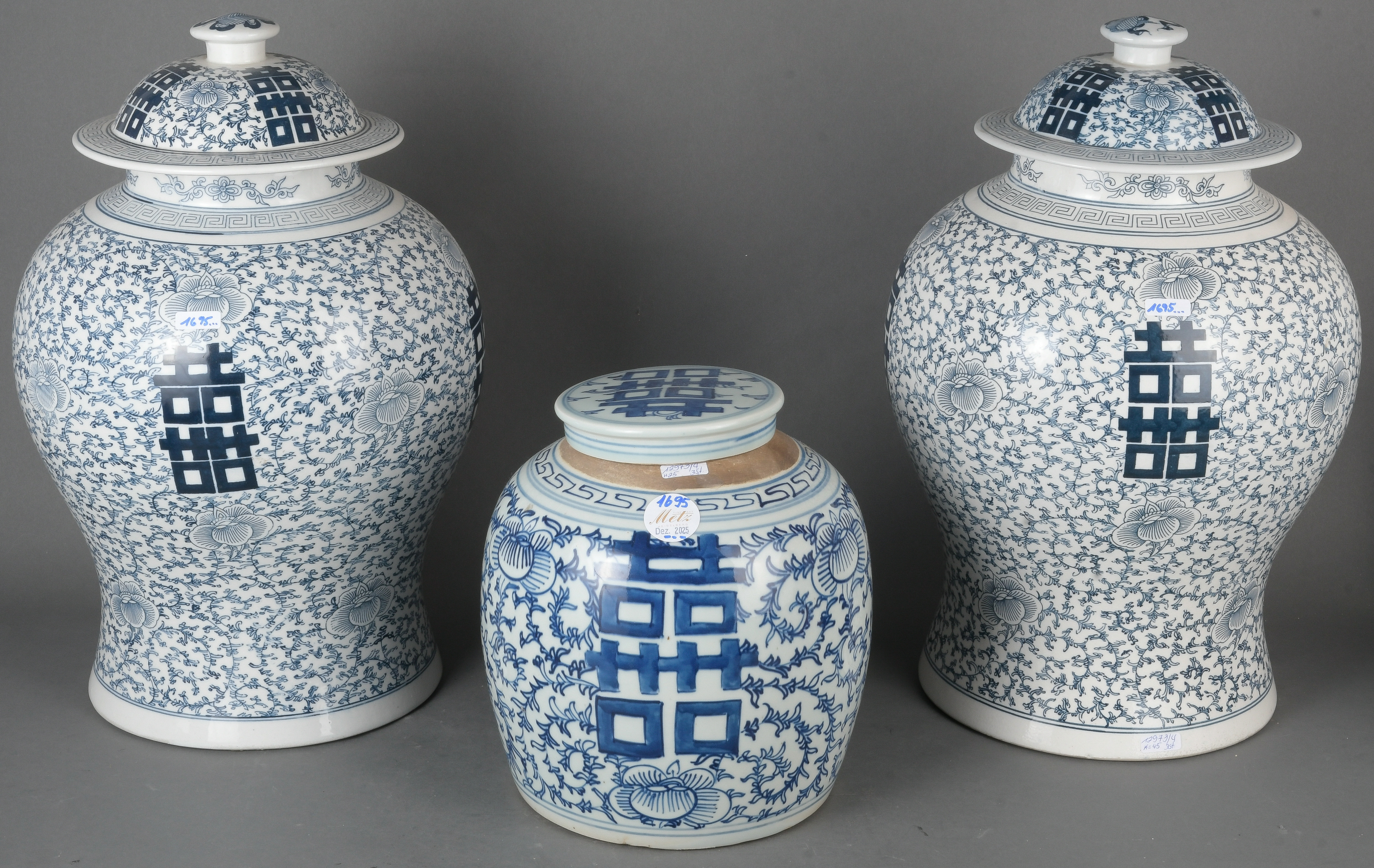 - Katalog-Nr: 1695Paar Deckelvasen und Ingwertopf. Asien. Porzellan, unterglasurblau bemalt; ohne Marke, H=25 / je 45 cm.o.L.
