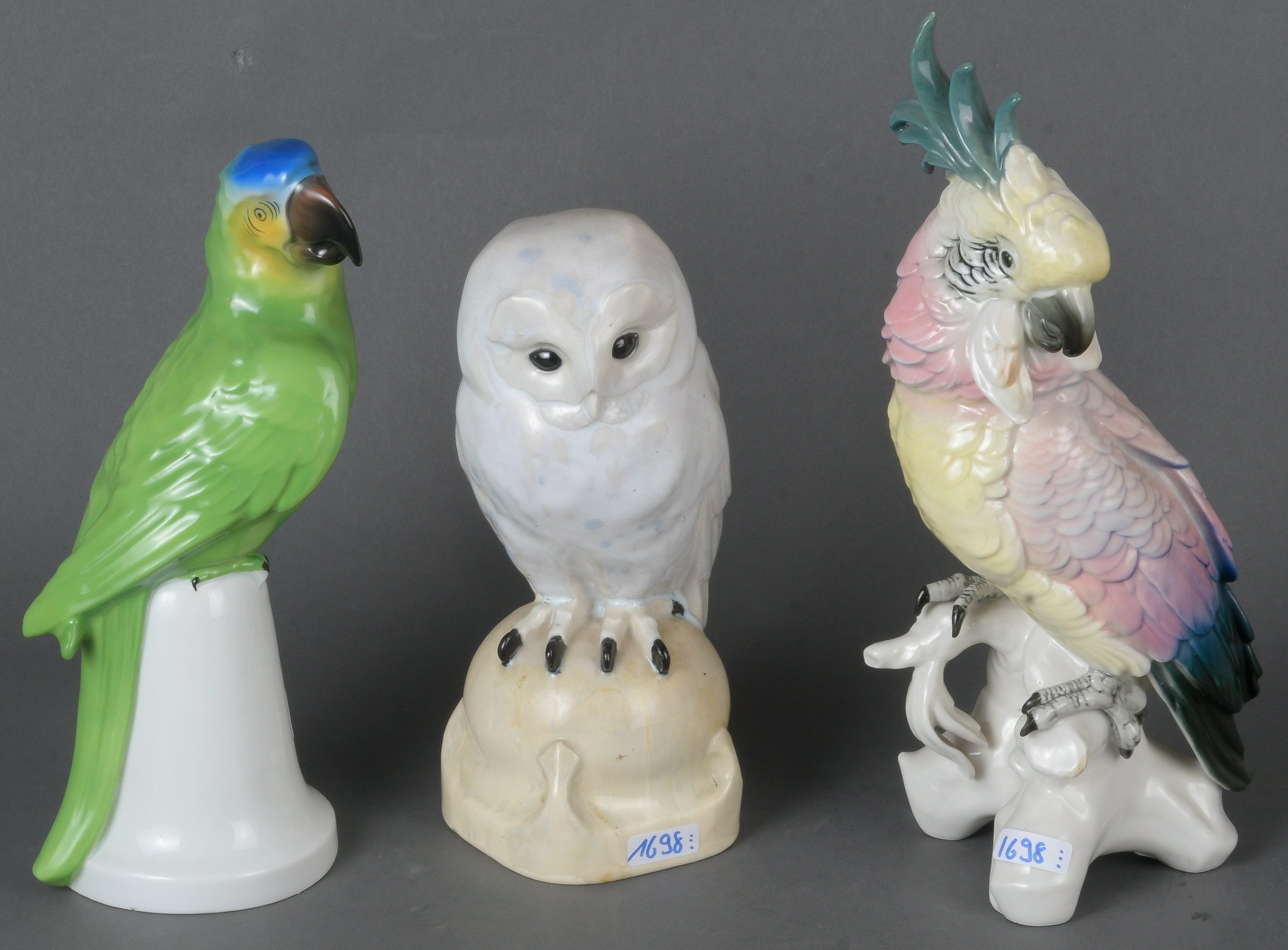 - Katalog-Nr: 1698Blaustirnamazone, Kakadu und Kauz, u.a. F. Krug, München / Volkstedt-Ens 20. Jh. Keramik / Porzellan, bunt bemalt; am Boden gemarkt, H=21 bis 28 cm.o.L.