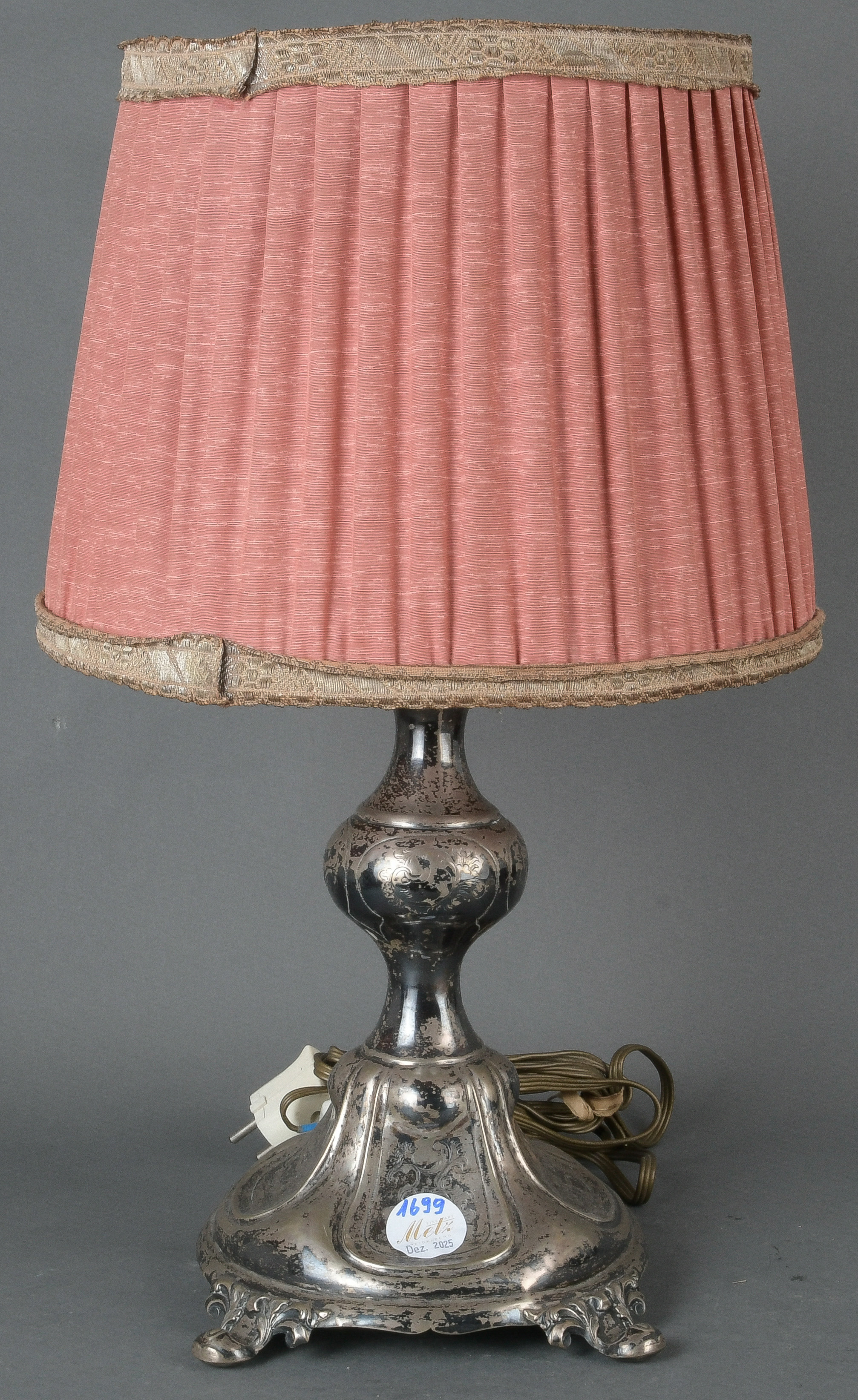- Katalog-Nr: 1699Tischlampe. Wohl deutsch 20. Jh. Mit Silberfuß, teilw. graviert, seitl. gepunzt, H=26,5 / 48 cm. (Funktion ungeprüft)o.L.