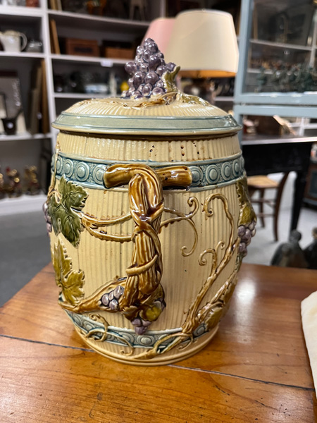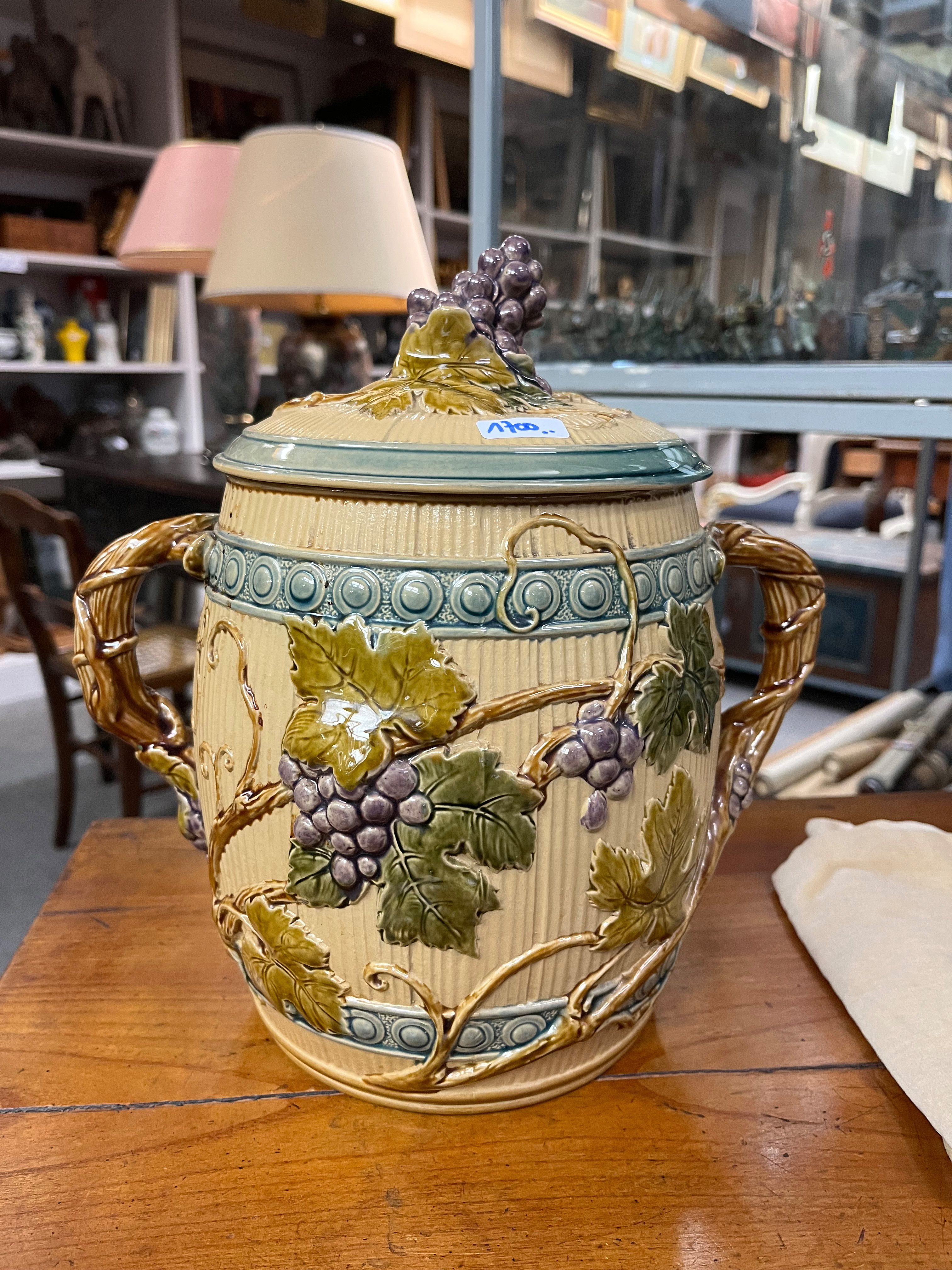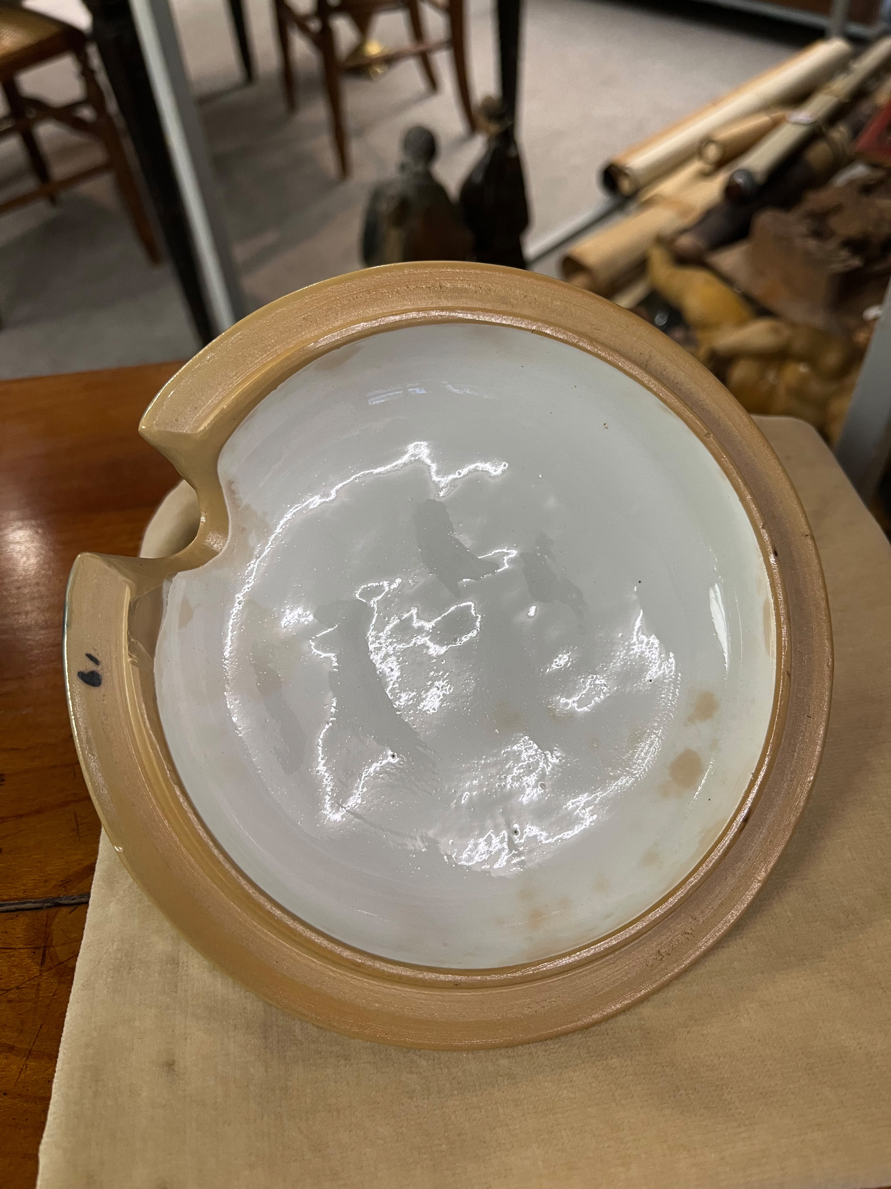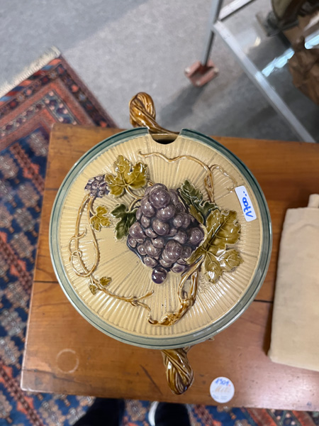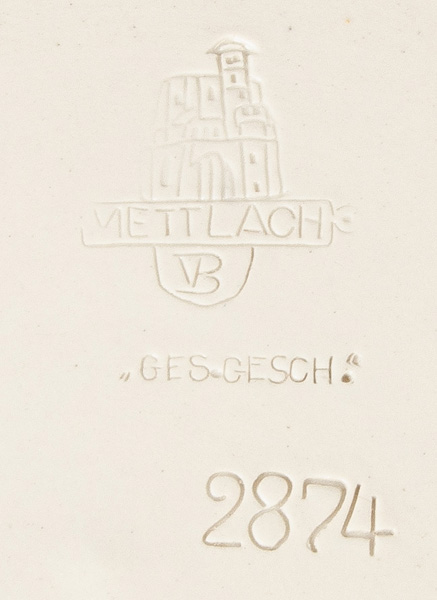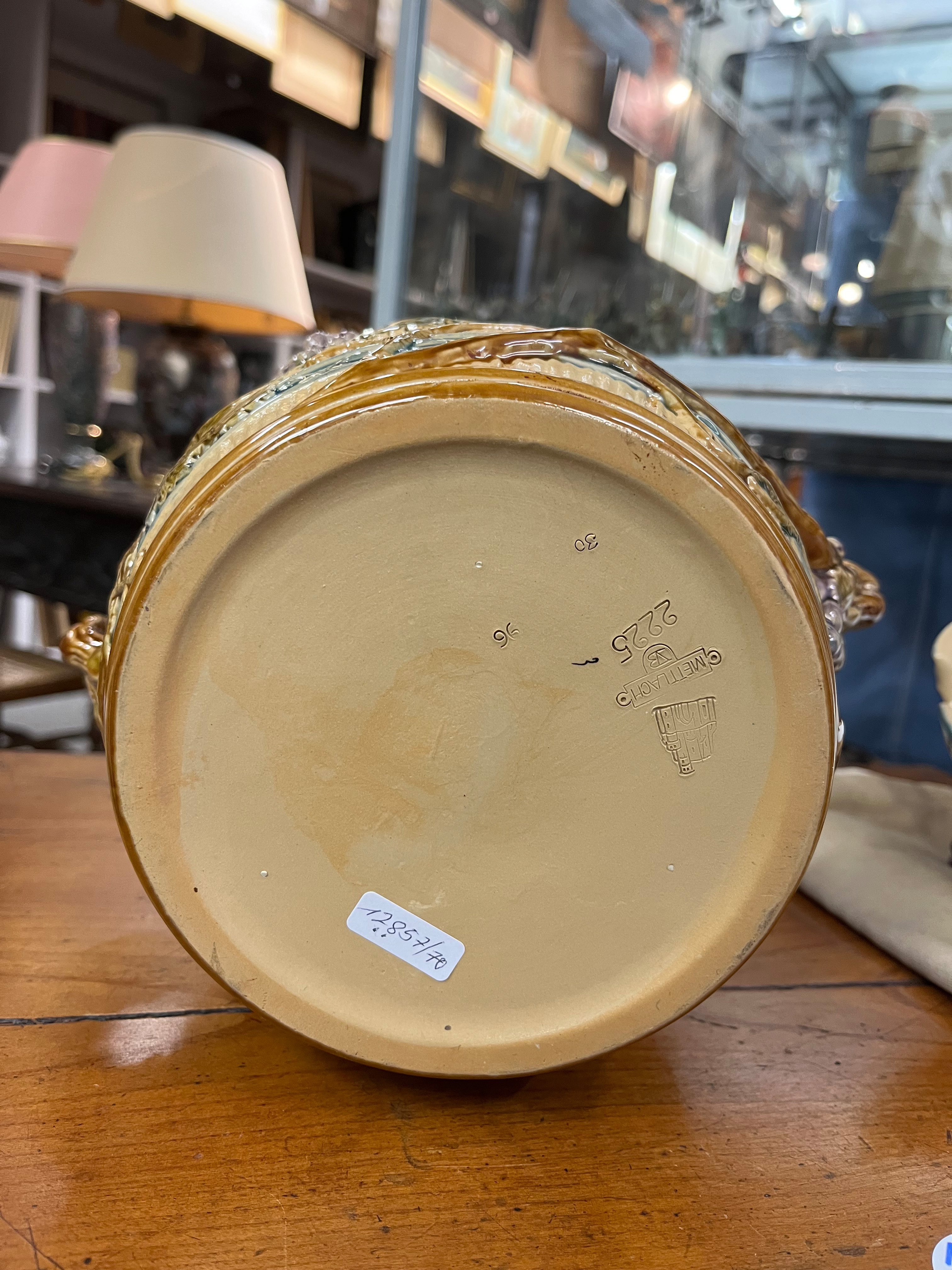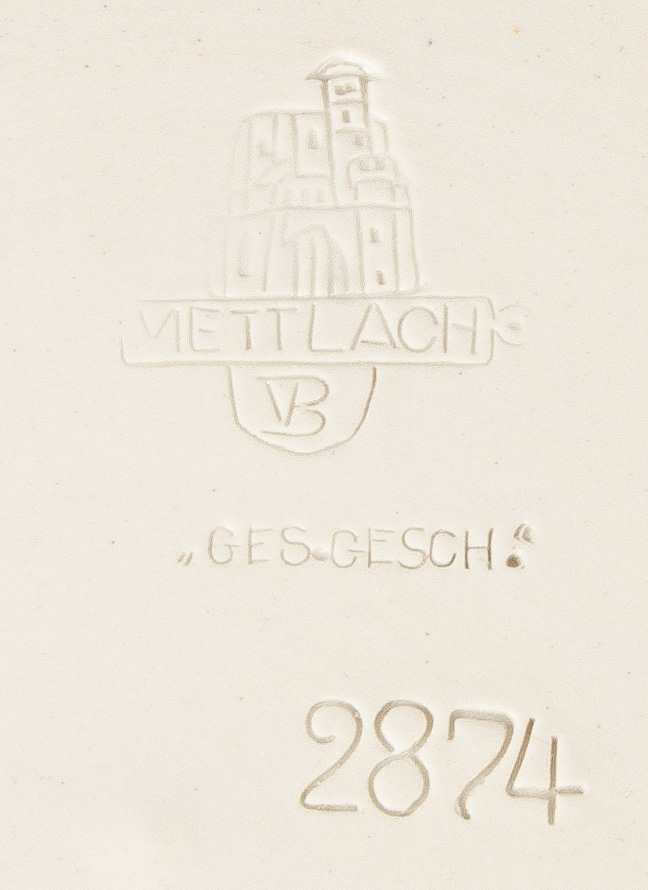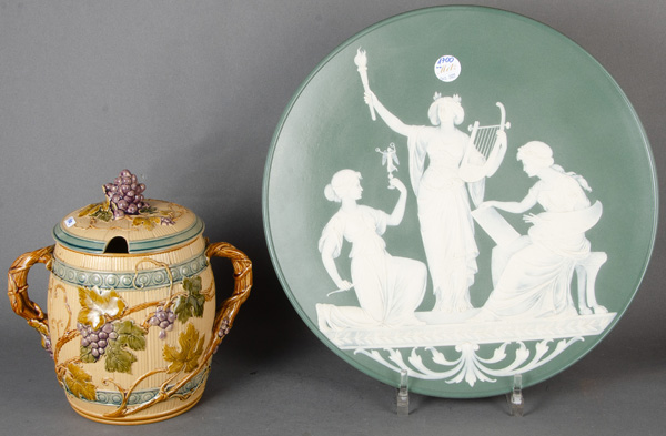 - Katalog-Nr: 1700Große Prunkplatte und Bowletopf. Mettlach 19./20. Jh. Feinsteinzeug, reliefiert und bemalt; am Boden gemarkt, D=44,5 cm / H=28 cm.o.L.