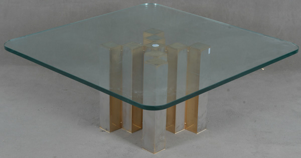 - Katalog-Nr: 1676Couchtisch. Italien, Manufaktur Ricon 1970er Jahre. Messingfuß, poliert, mit dicker quadratischer Glasplatte; Inspiration von Willy Rizzo (1928-2013), H=41 cm, B=95 cm, T=95 cm.o.L.