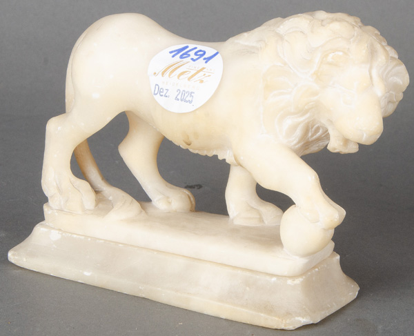 - Katalog-Nr: 1691Schreitender Löwe. Wohl Italien. Alabaster, gehauen, H=9,5 cm.o.L.