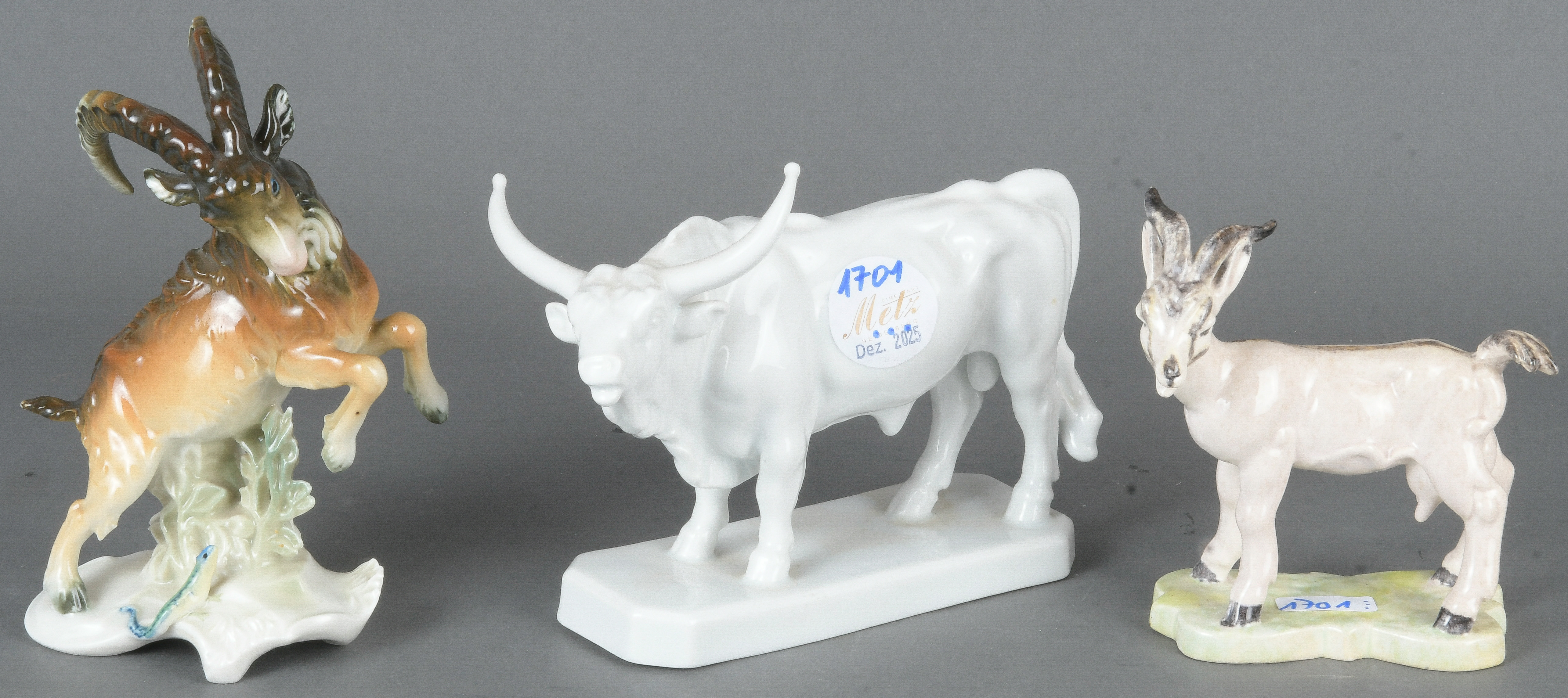 - Katalog-Nr: 1701Wasserbüffel, Steinbock und Ziege. Herend / Volkstedt-Ens / Wien 20. Jh. Porzellan / Feinsteinzeug, weiß glasiert bzw. bunt bemalt; am Boden gemarkt, H=11,5 bis 16 cm.o.L.