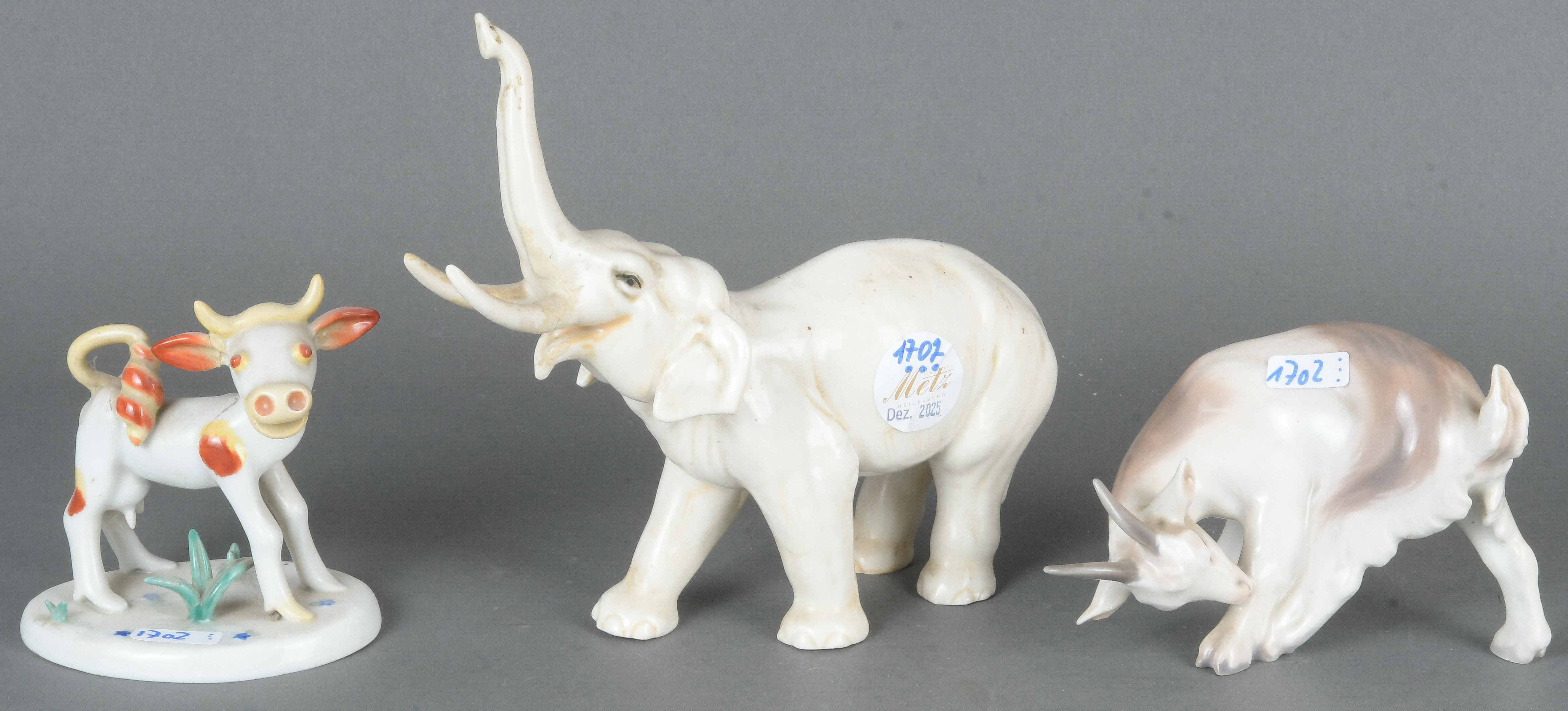 - Katalog-Nr: 1702Elefant, Kuh und Ziege. Bing & Grøndahl / Metzler & Ortloff / Volkstedt-Ens 20. Jh. Porzellan, bunt bemalt; am Boden gemarkt, H=11 bis 19,5 cm. (teilw. besch.)o.L.