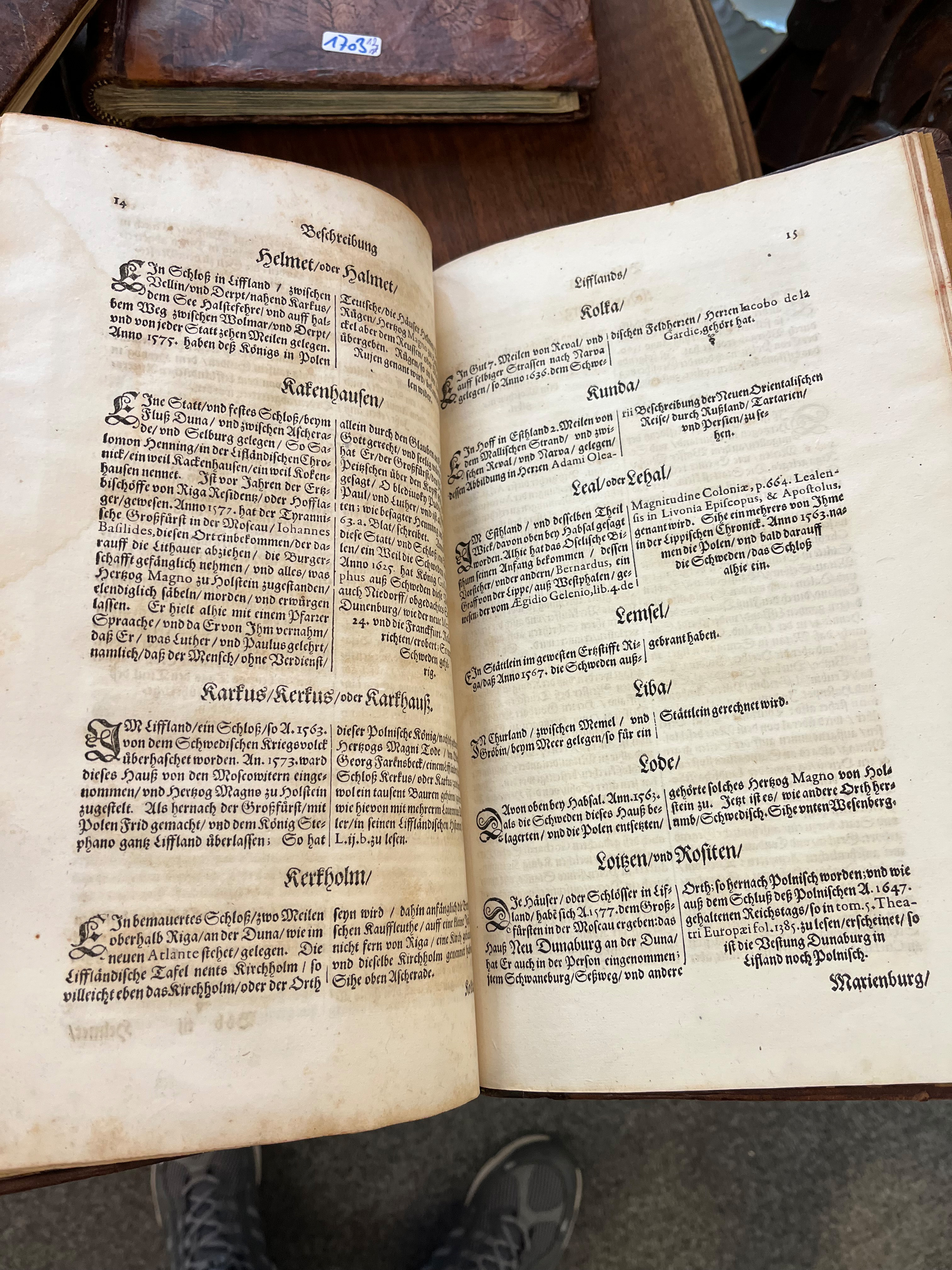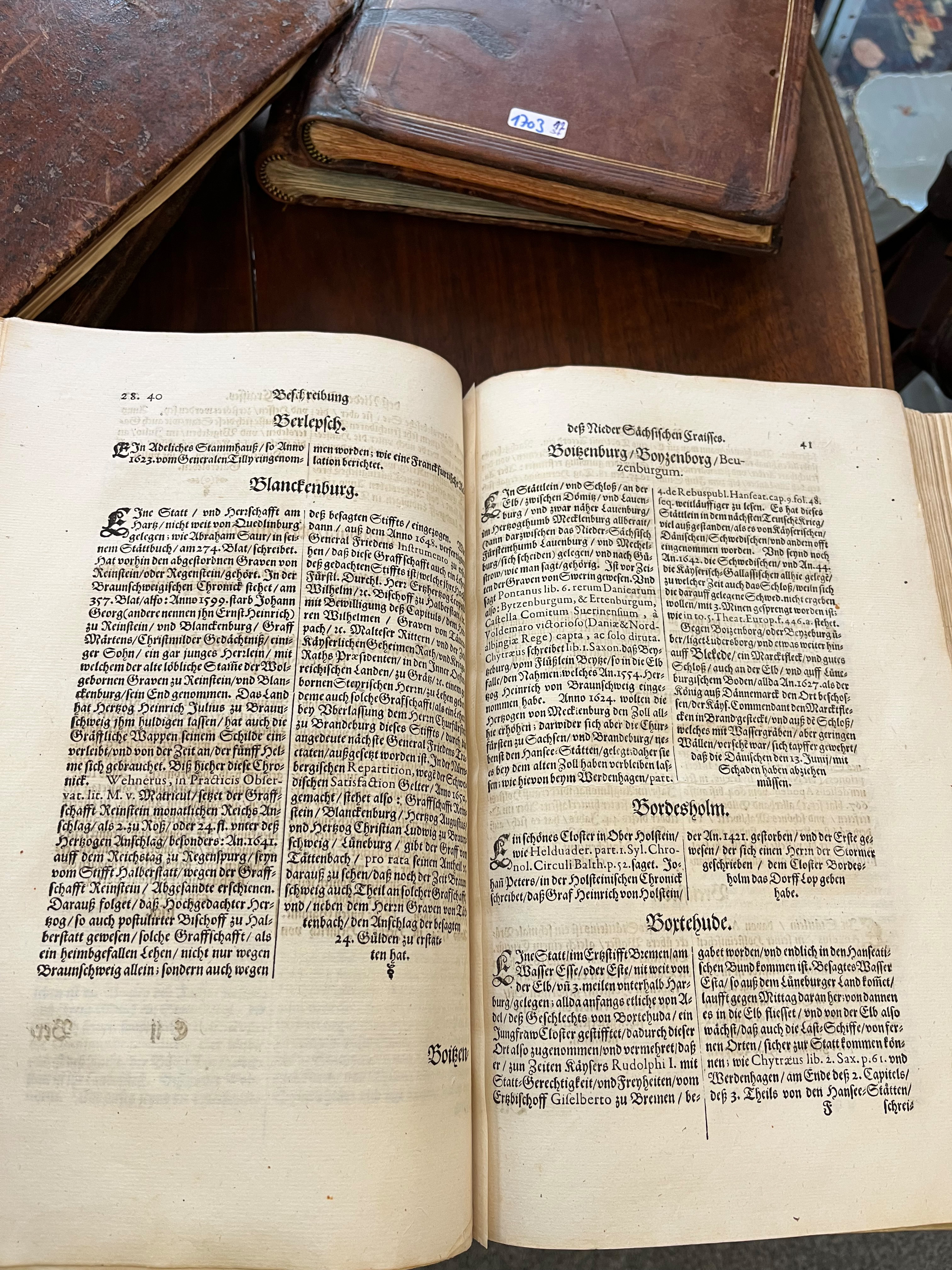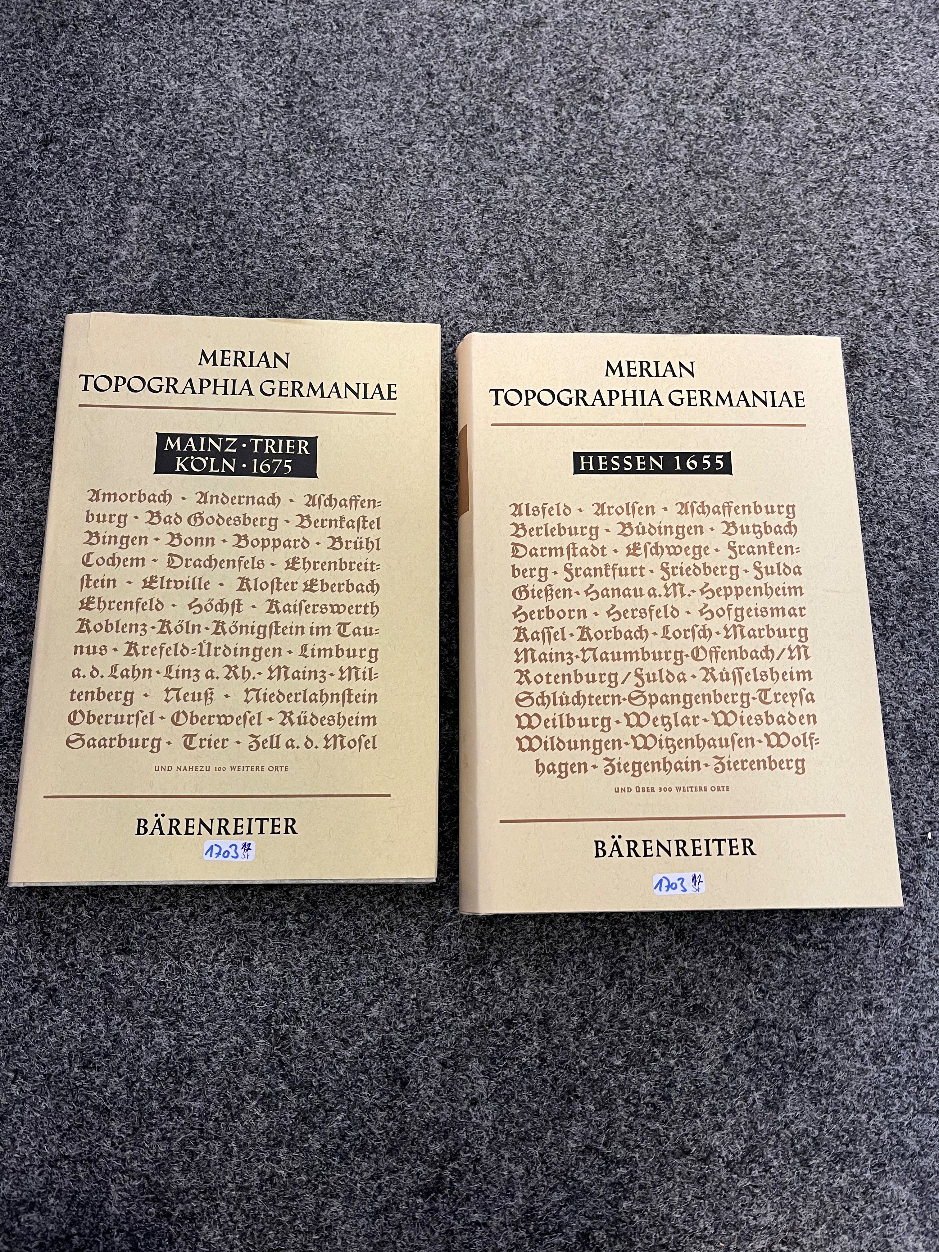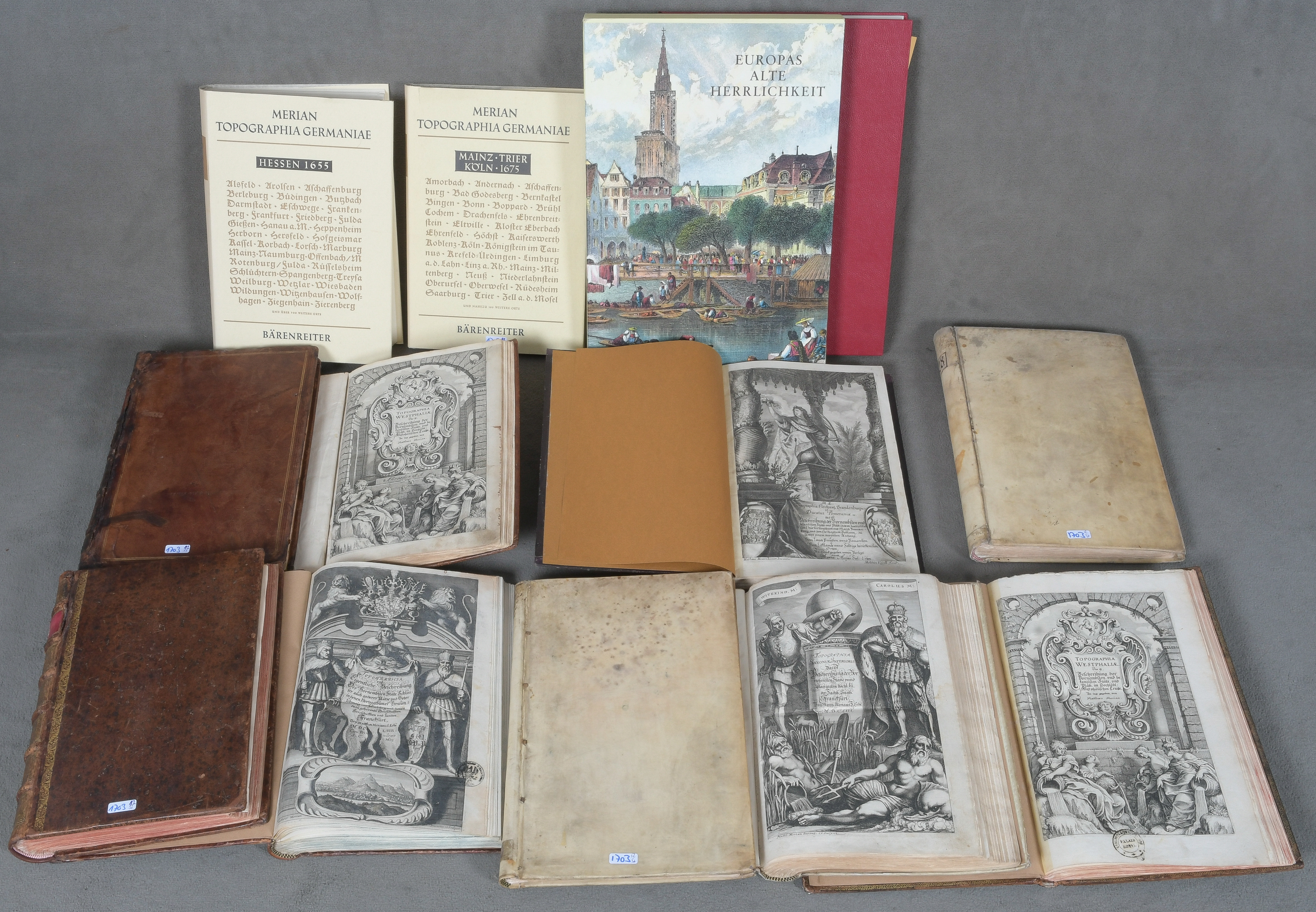 - Katalog-Nr: 1703Konvolut topographische Ganzleder bzw. Ganzpergamentbände: Matthäus Merian u.a. Westphalen, Franken, Bayern & Schwaben, Brandenburg mit Pommern, Braunschweig & Lüneburg, Erzbistum Mainz (1646). (Gebrauchsspuren, teilw. besch.)o.L.