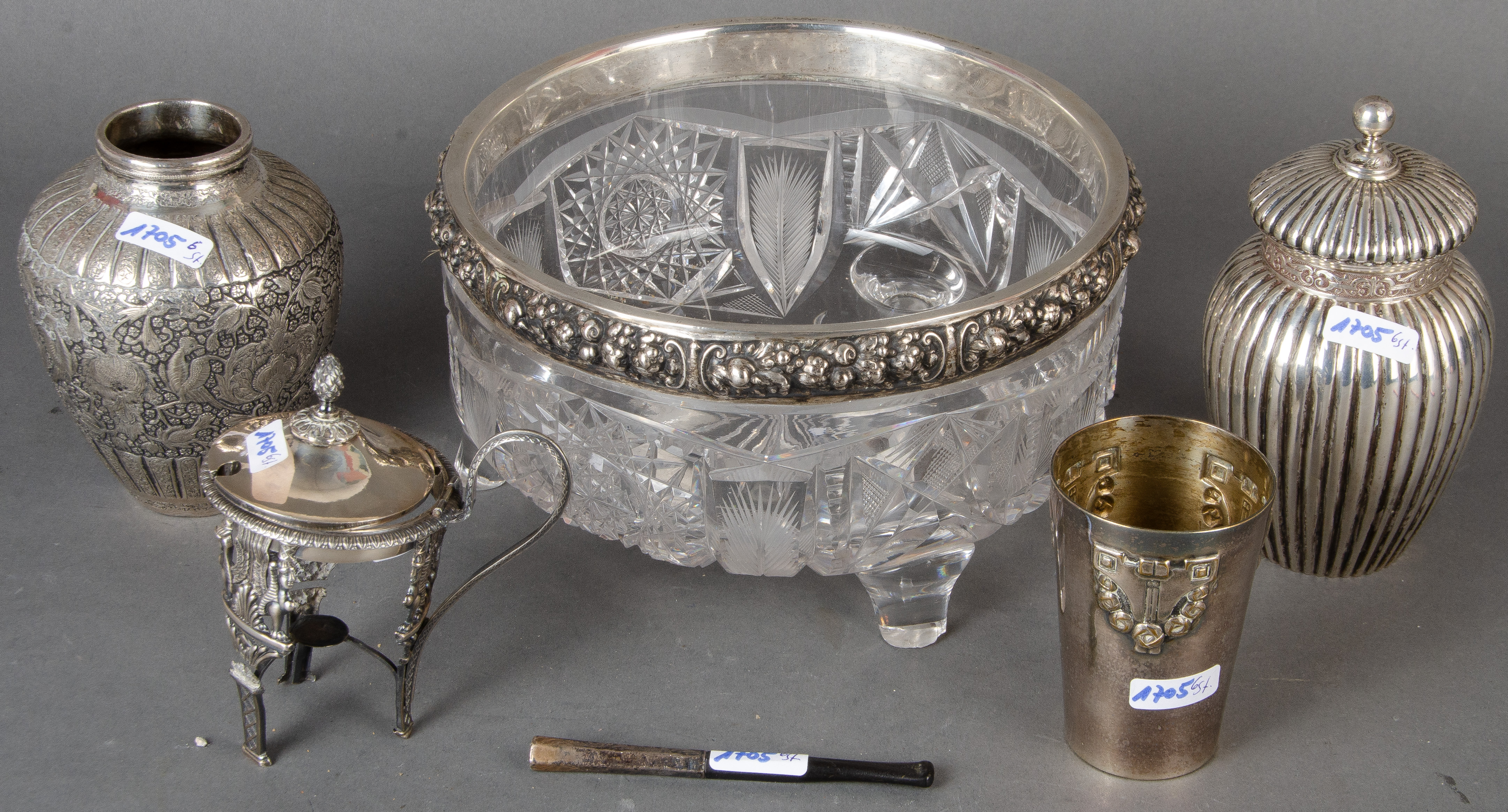 - Katalog-Nr: 1705Sechstlgs. Konvolut 800er Silber, ca. 595 g, u.a., meist deutsch 19./20. Jh. Bestehend aus: Ein Becher (H=8,2 cm), eine Deckelvase (H=14,2 cm), ein Gestell ohne Glas (H=11 cm), eine Glasschale mit Silberrand (H=12 cm, D=20 cm / Glas besch.), eine Vase (H=11,5 cm) und eine Zigarettenspitze.o.L.