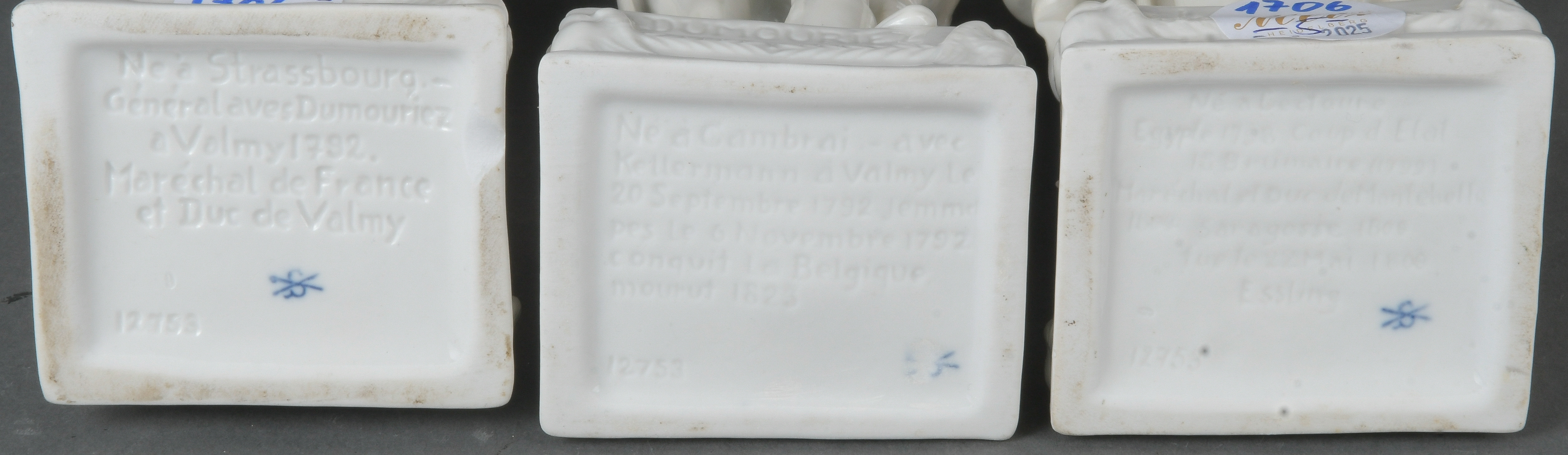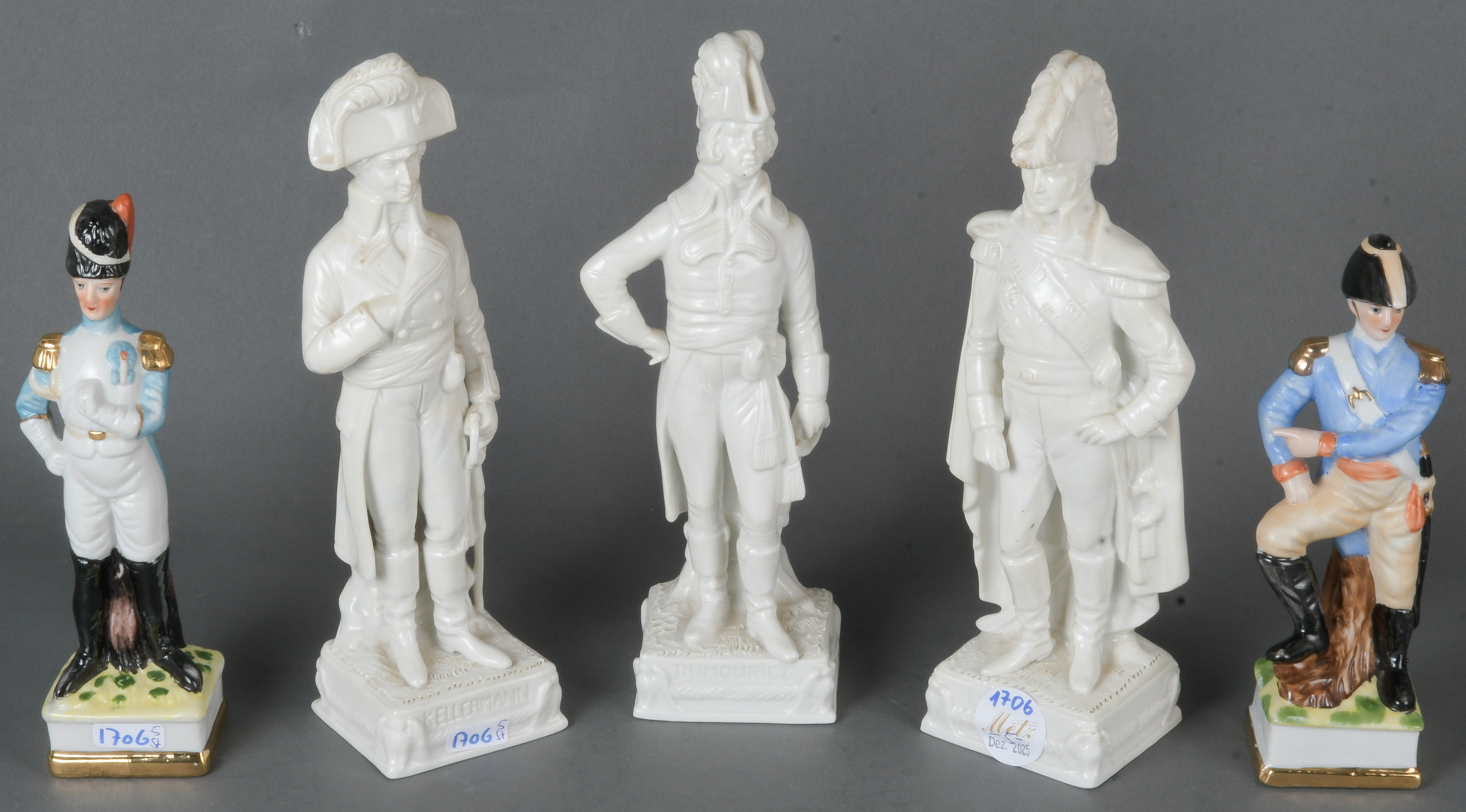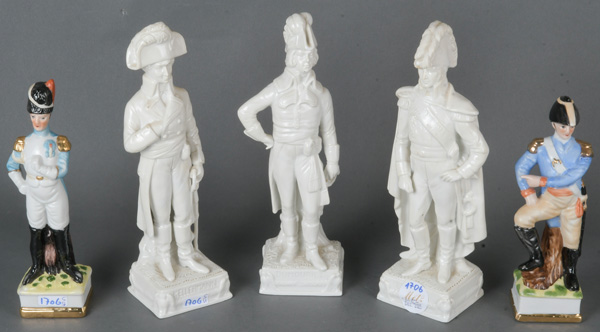 - Katalog-Nr: 1706Fünf Soldaten, u.a. Sitzendorf 20. Jh. Porzellan, weiß glasiert bzw. bunt bemalt; teilw. am Boden gemarkt, H=21 / 26,5 cm.o.L.
