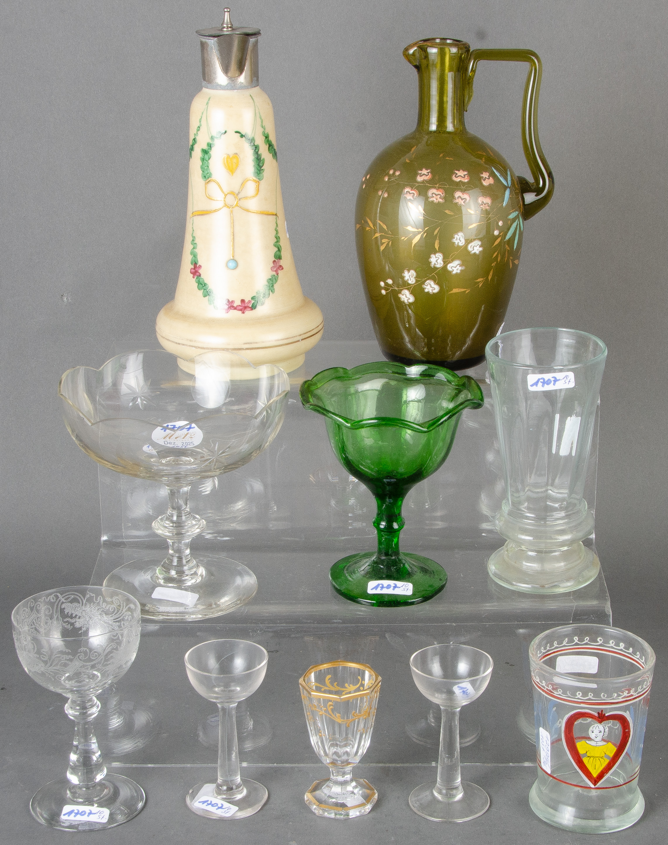 - Katalog-Nr: 1707Zehntlgs. Konvolut. Deutsch / Frankreich 19./20. Jh. Glas, teilw. geätzt bzw. mit Emailaufschmelzungen. Bestehend aus: Zwei Karaffen (H=19,5 / 22 cm), ein Paar Likörkelche (H=9 cm) und sechs weitere Gläser (H=7,8 / 14,4 cm). (best.)o.L.