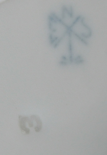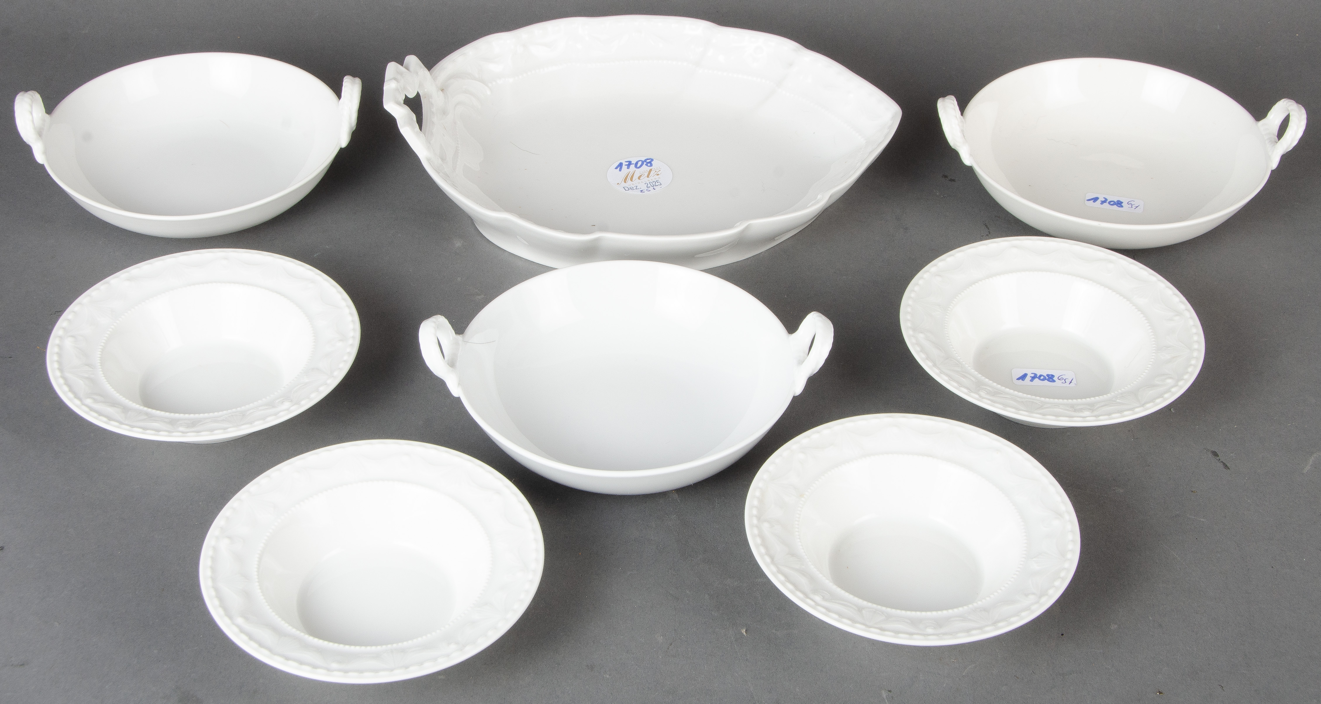 - Katalog-Nr: 1708Acht unterschiedliche Formteile. Berlin 20. Jh. Porzellan, weiß glasiert; am Boden unterglasurblaue Szeptermarke. Bestehend aus: Eine Blattschale (H=5,5 cm, B=23,5 cm, T=18,5 cm), vier runde Schalen „Korbflechtrelief“ (D=je 12,2 cm) und drei Henkelschalen (D=je 13,8 cm).o.L.